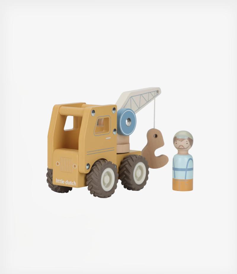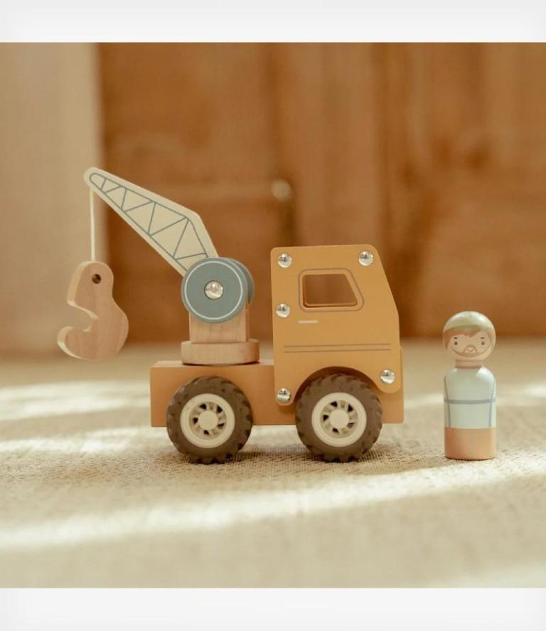 Το ξύλινο γερανοφόρο όχημα διαθέτει περιστρεφόμενο βραχίονα και συνοδεύεται από έναν εργάτη οικοδομών.
