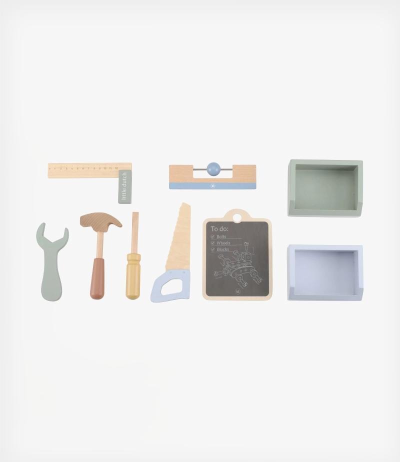 Ο πάγκος εργασίας διαθέτει μια σχάρα αποθήκευσης με 4 γρανάζια, έναν πίνακα κιμωλίας, δύο αποθηκευτικούς κάδους και μια μέγγενη. Έρχεται με ένα σετ 55 εξαρτημάτων που περιλαμβάνει παξιμάδια και μπουλόνια, βίδες, πάνελ, τροχούς και βασικά εργαλεία όπως σφυρί, πριόνι, κατσαβίδι, χάρακα και κλειδί. Ο στιβαρός ξύλινος πάγκος εργασίας σε μοντέρνα χρώματα δημιουργεί έναν υπέροχο χώρο παιχνιδιού στο παιδικό δωμάτιο, αλλά θα φαίνεται υπέροχος και σε ένα σαλόνι.