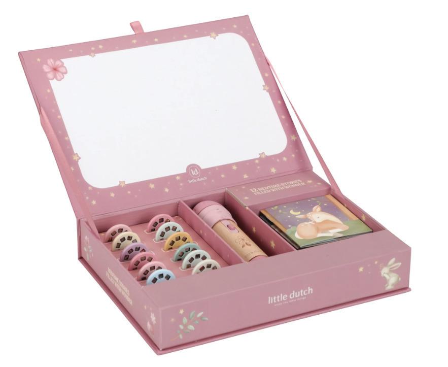 Περιλαμβάνει 12 δίσκους με μοναδικές ιστορίες, οι οποίες προβάλλονται στον τοίχο μέσα από υπέροχες εικονογραφήσεις. Κάθε ιστορία συνοδεύεται από το αντίστοιχο βιβλίο, επιτρέποντας στα παιδιά να ακολουθήσουν την πλοκή με εικόνες και λόγια.