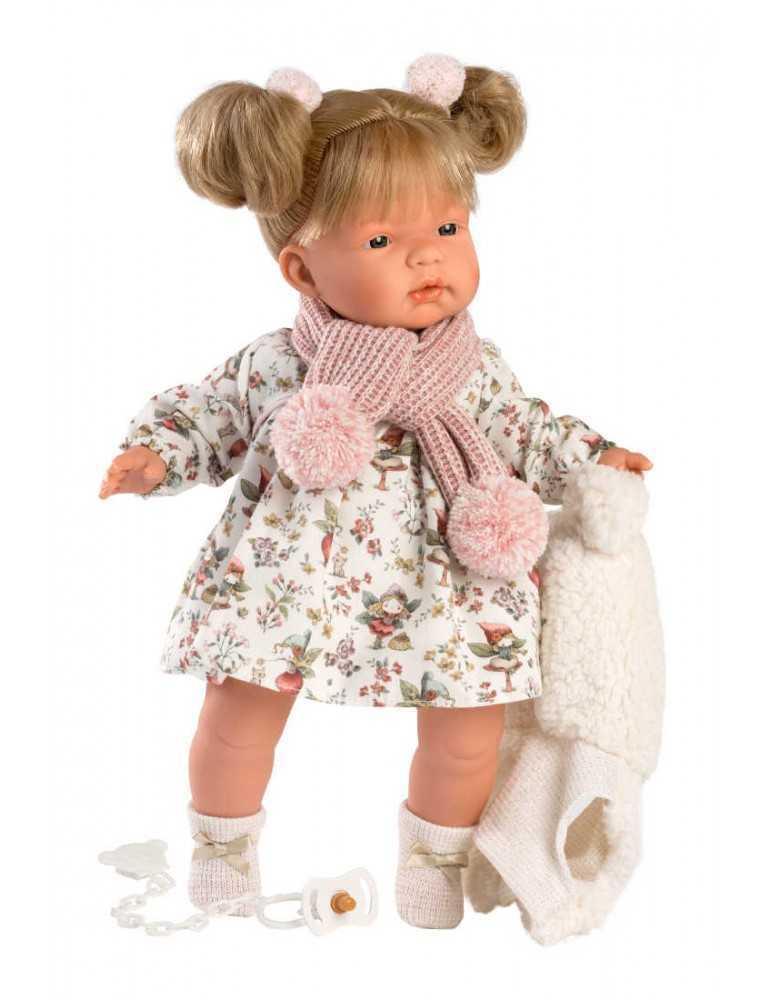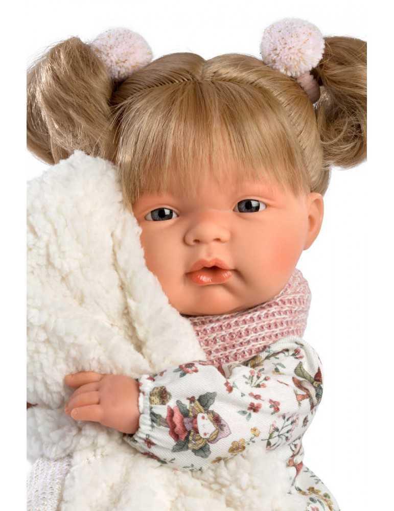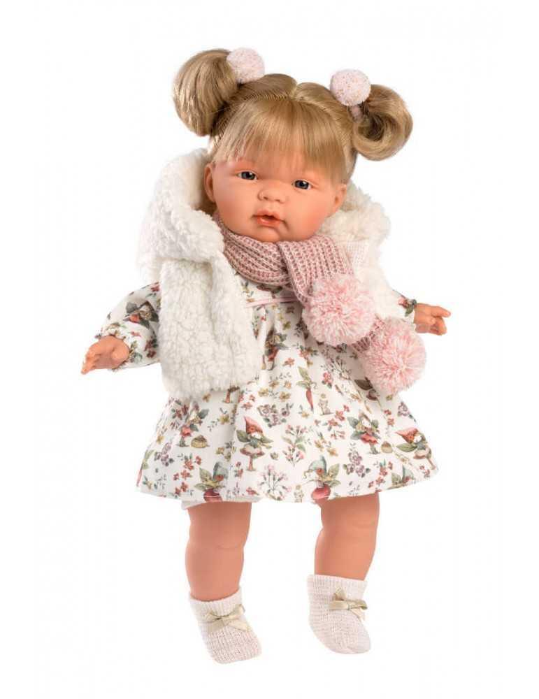 Ξανθιά 38cm με λουλουδέ φόρεμα, λευκό γουνάκι και ροζ κασκολ με πιπίλα, καλτσάκια και δύο εντυπωσιακούς λαστιχάκια κότσους.Κατασκευασμένη στην Ισπανία, βγάζοντας την πιπίλα κλαίει και λέει ” Μαμά.. Μπαμπά…”, όποτε ξαναβάλετε την πιπίλα σταματάει. Φοράει εξαιρετικά ρούχα και έχει εκπληκτικές λεπτομέριες.
