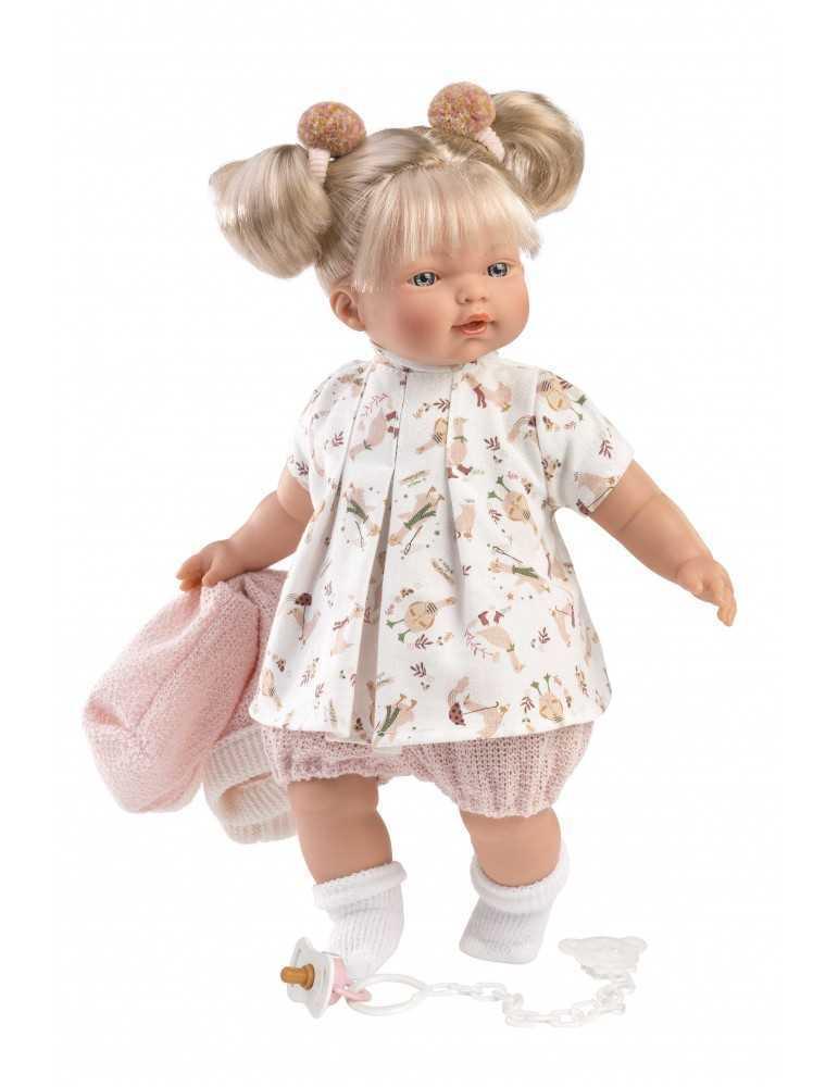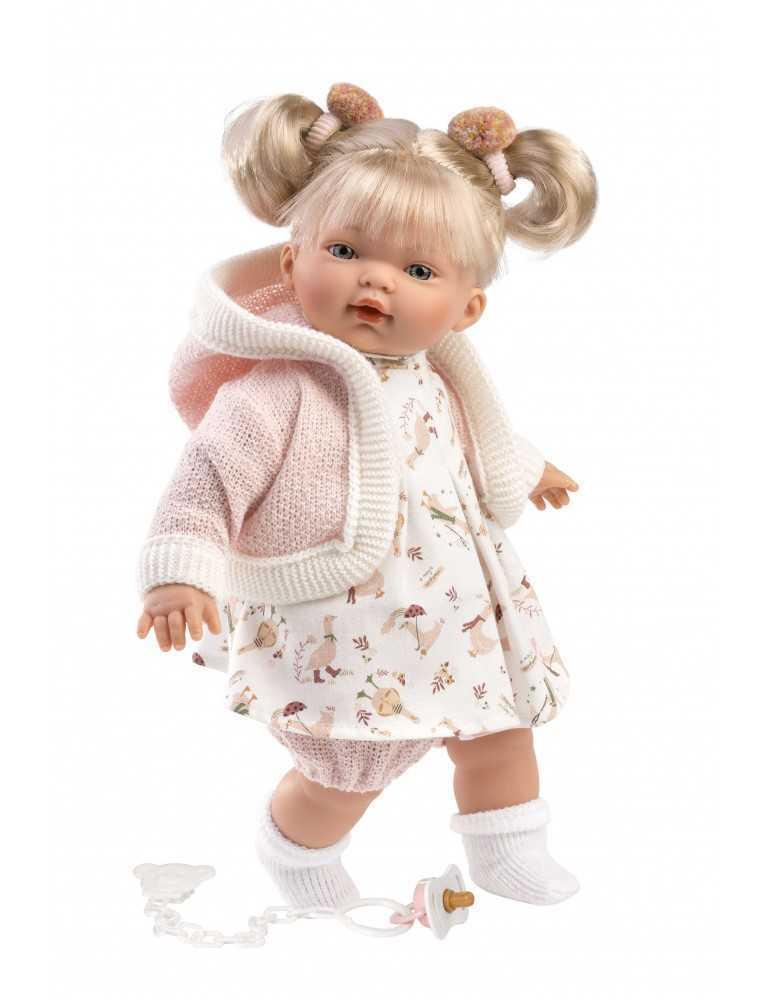 Ξανθιά 33cm με λευκό φόρεμα και ροζ ζακέτα με πιπίλα, καλτσάκια και δύο εντυπωσιακούς λαστιχάκια κότσους. Κατασκευασμένη στην Ισπανία, βγάζοντας την πιπίλα κλαίει και λέει ” Μαμά.. Μπαμπά…”, όποτε ξαναβάλετε την πιπίλα σταματάει. Φοράει εξαιρετικά ρούχα και έχει εκπληκτικές λεπτομέριες.