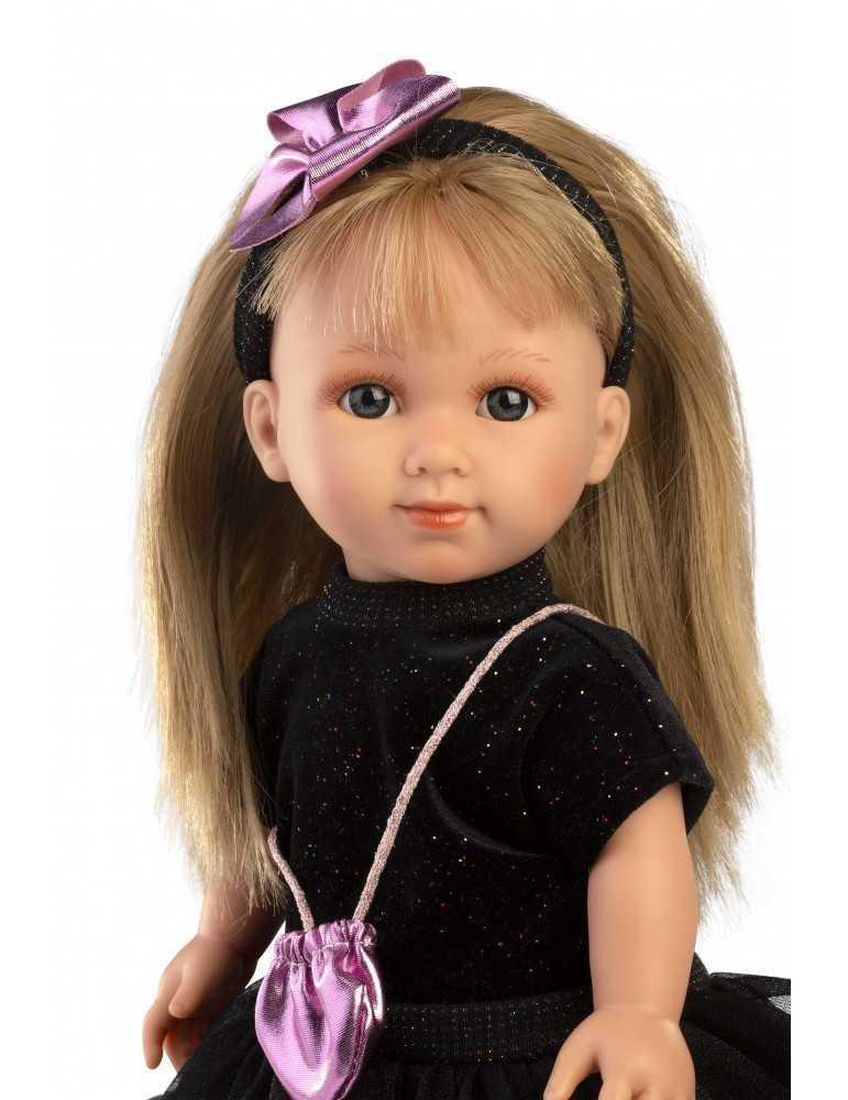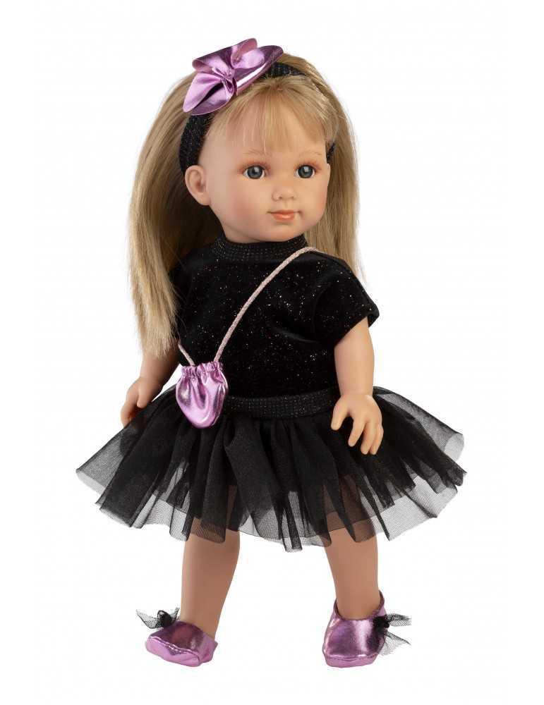 Εκπληκτική κούκλα με μαλακό σώμα ξανθιά 35cm με μάυρη μπλούζα με glitter και μαυρη τούλινη φούστα. Κατασκευασμένη στην Ισπανία. Φοράει εξαιρετικά χειροποιητα ρούχα και έχει εκπληκτικές λεπτομέριες