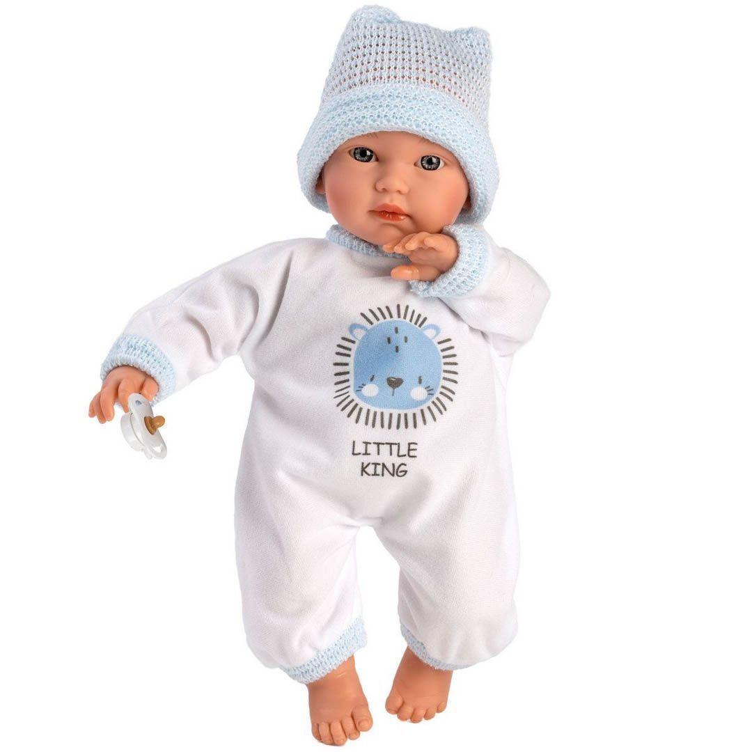 Η κούκλα φοράει ένα λευκό φορμάκι με ένα  χαριτωμένο σχέδιο λιονταράκι, γαλάζιο σκούφο και κρατάει την πιπίλα της,