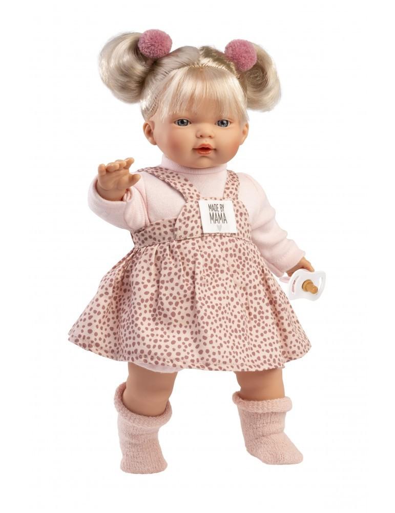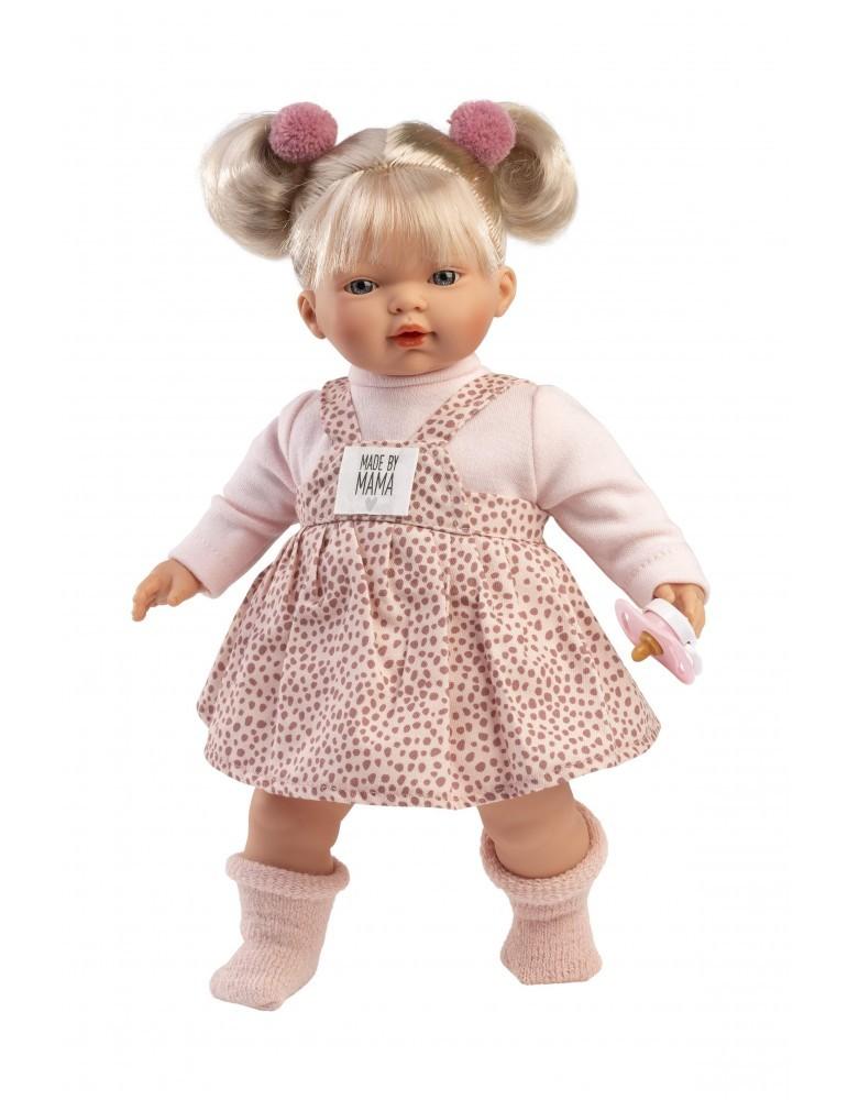 Kούκλα με μαλακό σώμα 33cm ξανθια με ροζ πουα φόρεμα, πιπίλα, καλτσάκια και δύο εντυπωσιακούς φιόγγους-κότσους. Κατασκευασμένη στην Ισπανία, βγάζοντας την πιπίλα κλαίει και λέει ” Μαμά.. Μπαμπά…”, όποτε ξαναβάλετε την πιπίλα σταματάει. Φοράει εξαιρετικά ρούχα και έχει εκπληκτικές λεπτομέριες.