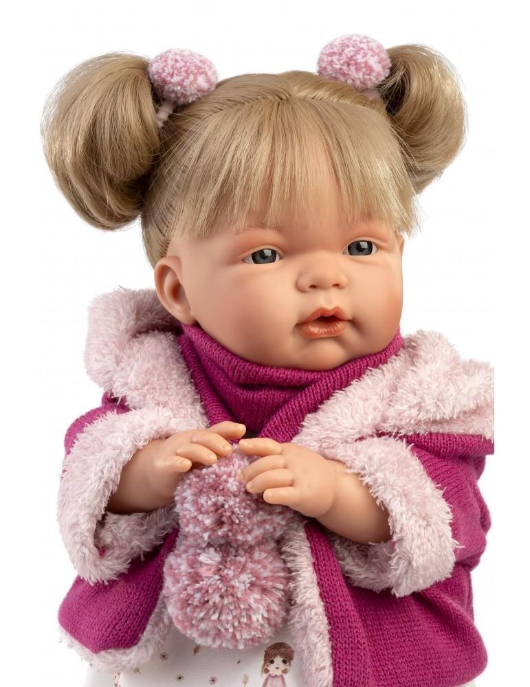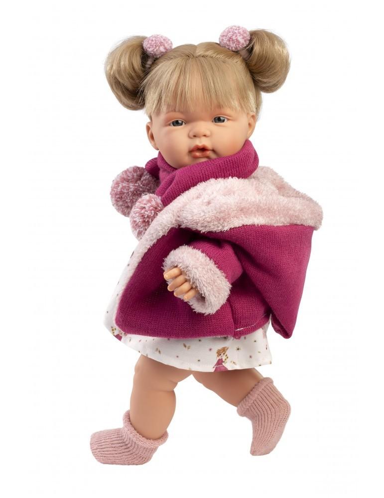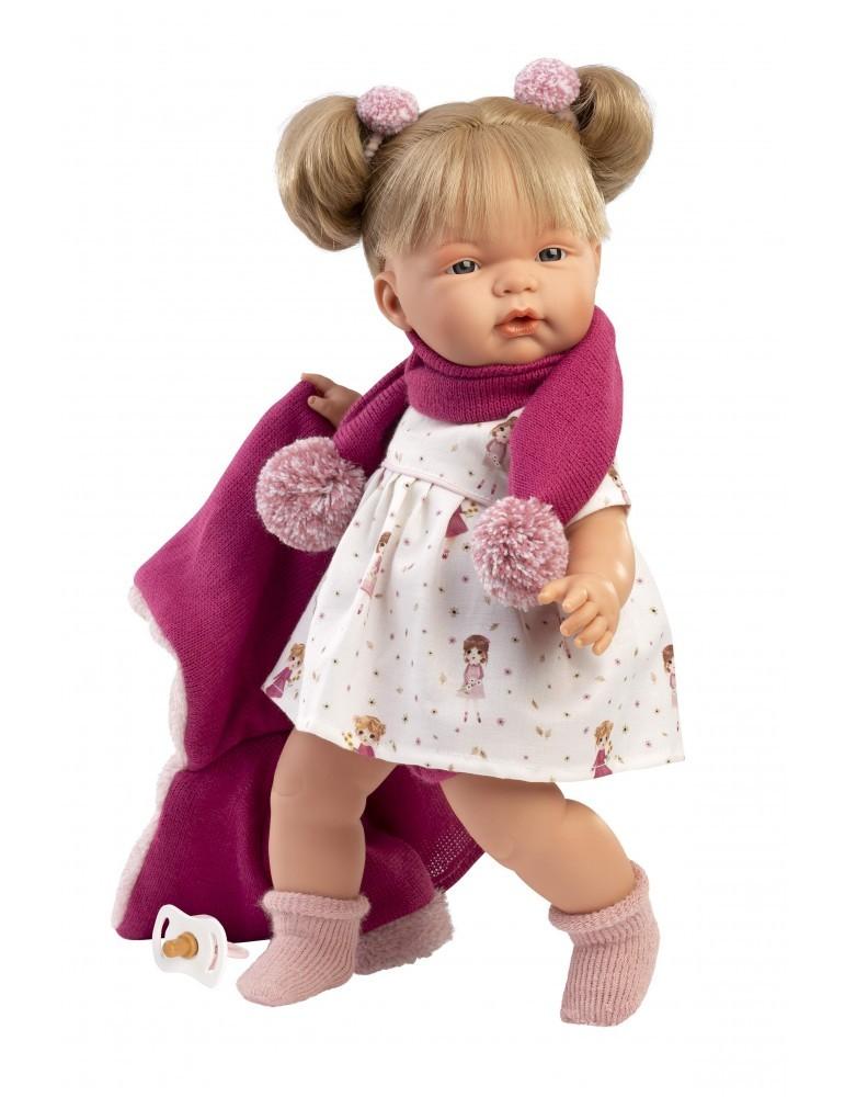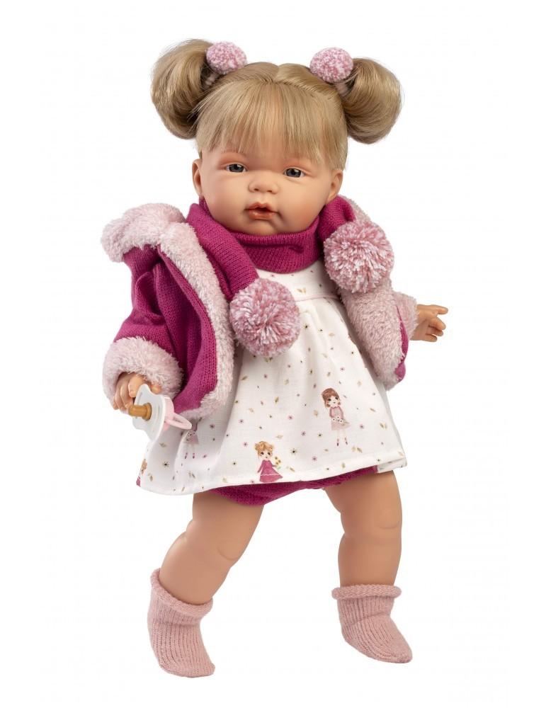Kούκλα με μαλακό σώμα 38cm ξανθια με λευκο φόρεμα κοριτσια ,ζακετα φουξ και κασκολ , πιπίλα, καλτσάκια και δύο εντυπωσιακούς φιόγγους-κότσους. Κατασκευασμένη στην Ισπανία, βγάζοντας την πιπίλα κλαίει και λέει ” Μαμά.. Μπαμπά…”, όποτε ξαναβάλετε την πιπίλα σταματάει. Φοράει εξαιρετικά ρούχα και έχει εκπληκτικές λεπτομέριες.