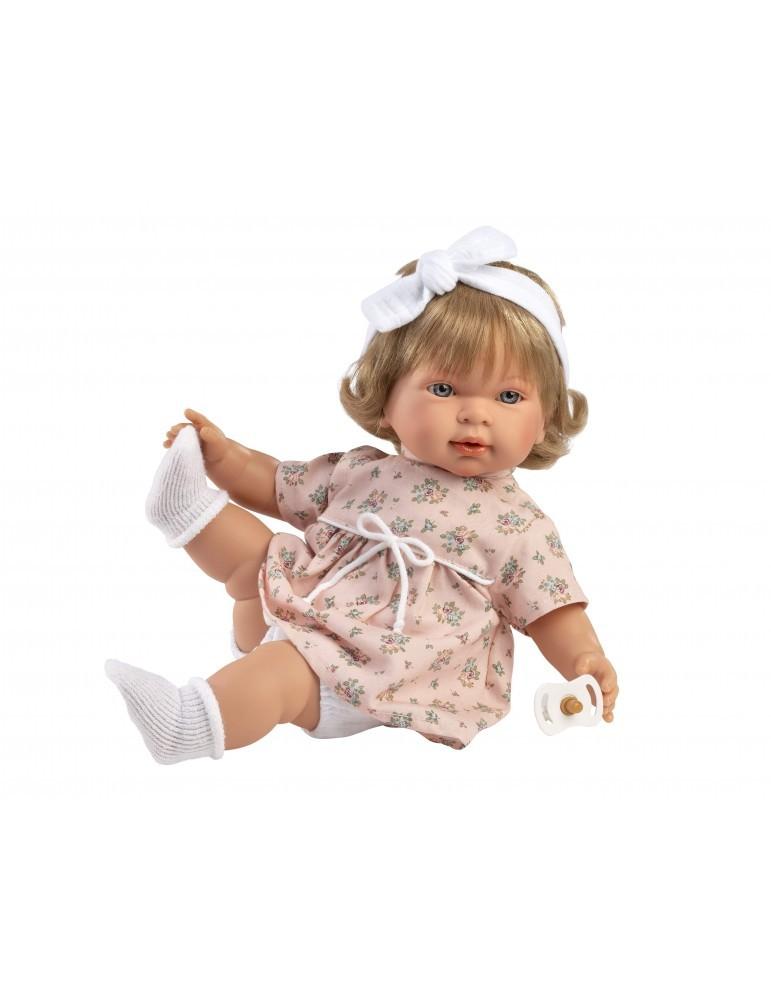 Kούκλα με μαλακό σώμα 42cm ξανθιά με φόρεμα ροζ φλοραλ ,κορδέλα λευκή, πιπίλα, καλτσάκια και δύο εντυπωσιακούς φιόγγους-κότσους. Κατασκευασμένη στην Ισπανία, βγάζοντας την πιπίλα κλαίει και λέει ” Μαμά.. Μπαμπά…”, όποτε ξαναβάλετε την πιπίλα σταματάει. Φοράει εξαιρετικά ρούχα και έχει εκπληκτικές λεπτομέριες.