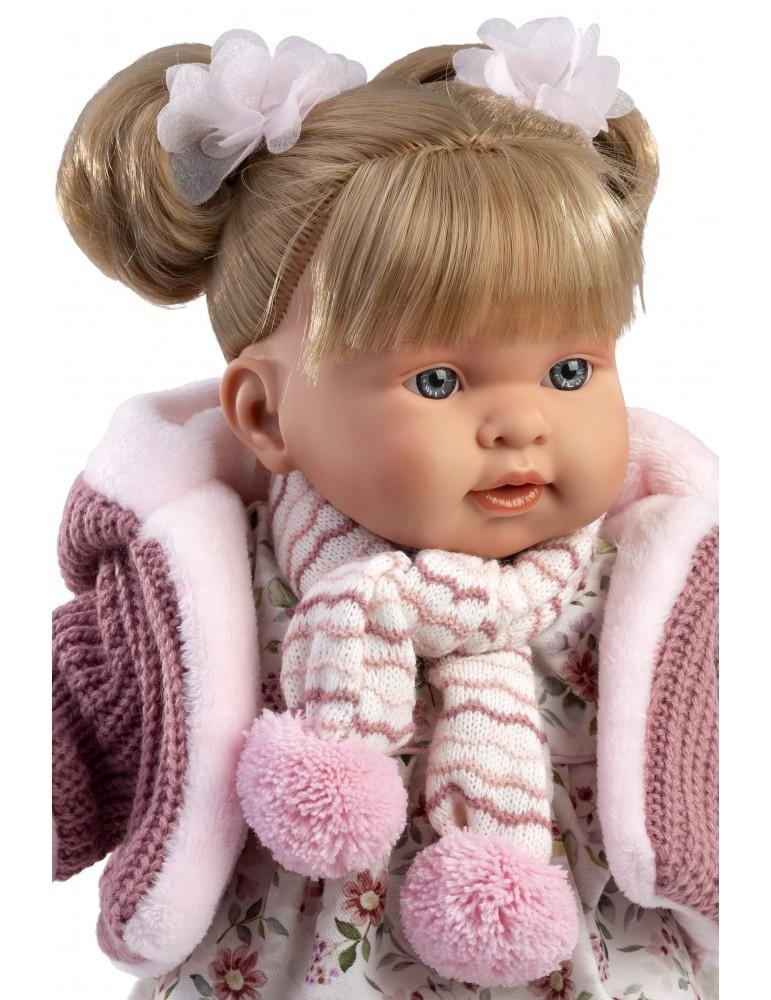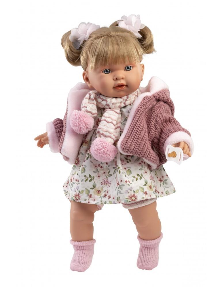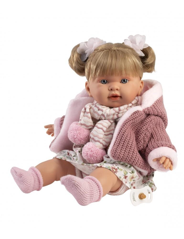 Kούκλα με μαλακό σώμα 42cm ξανθιά με φλοράλ φόρεμα ,ζακετα,κασκολ, πιπίλα, καλτσάκια και δύο εντυπωσιακούς φιόγγους-κότσους. Κατασκευασμένη στην Ισπανία, βγάζοντας την πιπίλα κλαίει και λέει ” Μαμά.. Μπαμπά…”, όποτε ξαναβάλετε την πιπίλα σταματάει. Φοράει εξαιρετικά ρούχα και έχει εκπληκτικές λεπτομέριες.