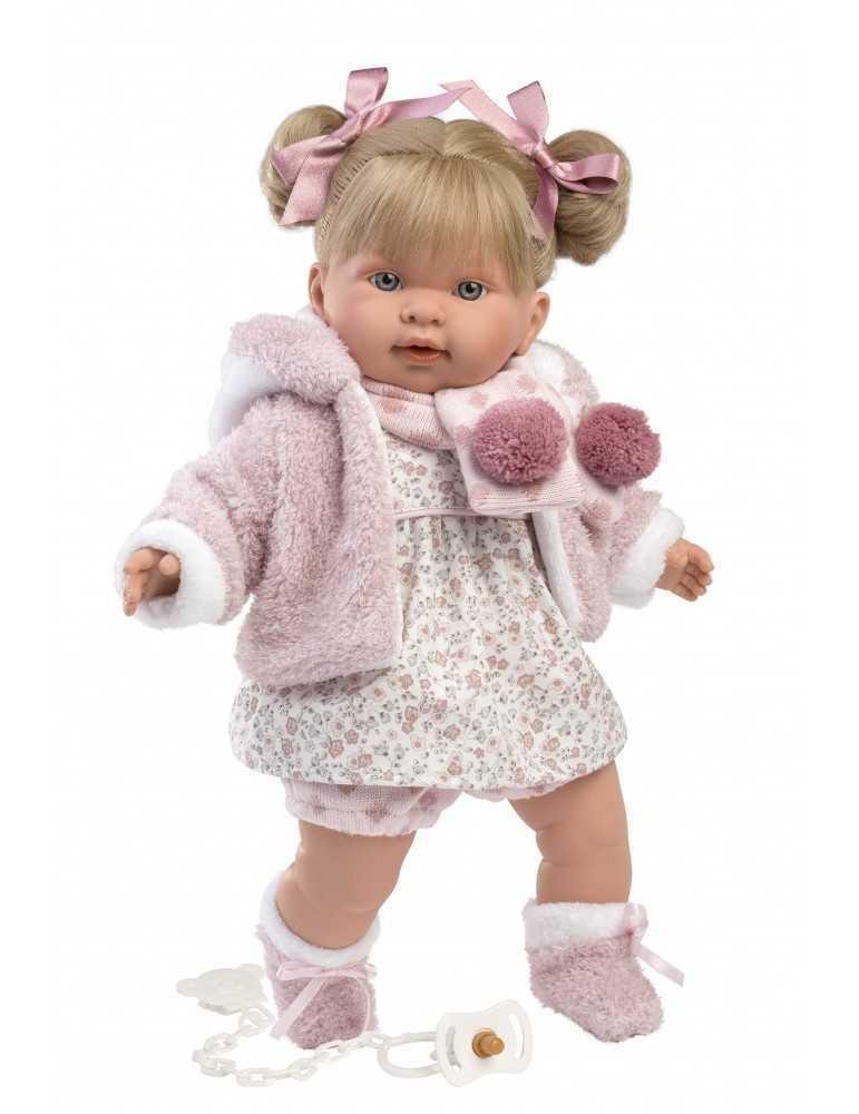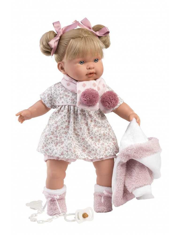 Ξανθιά 42cm με λευκό φόρεμα με λουλούδια και ροζ ζακέτα και κασκόλ με παλτό με πιπίλα, καλτσάκια και δύο εντυπωσιακούς λαστιχάκια κότσους. Κατασκευασμένη στην Ισπανία, βγάζοντας την πιπίλα κλαίει και λέει ” Μαμά.. Μπαμπά…”, όποτε ξαναβάλετε την πιπίλα σταματάει. Φοράει εξαιρετικά ρούχα και έχει εκπληκτικές λεπτομέριες.