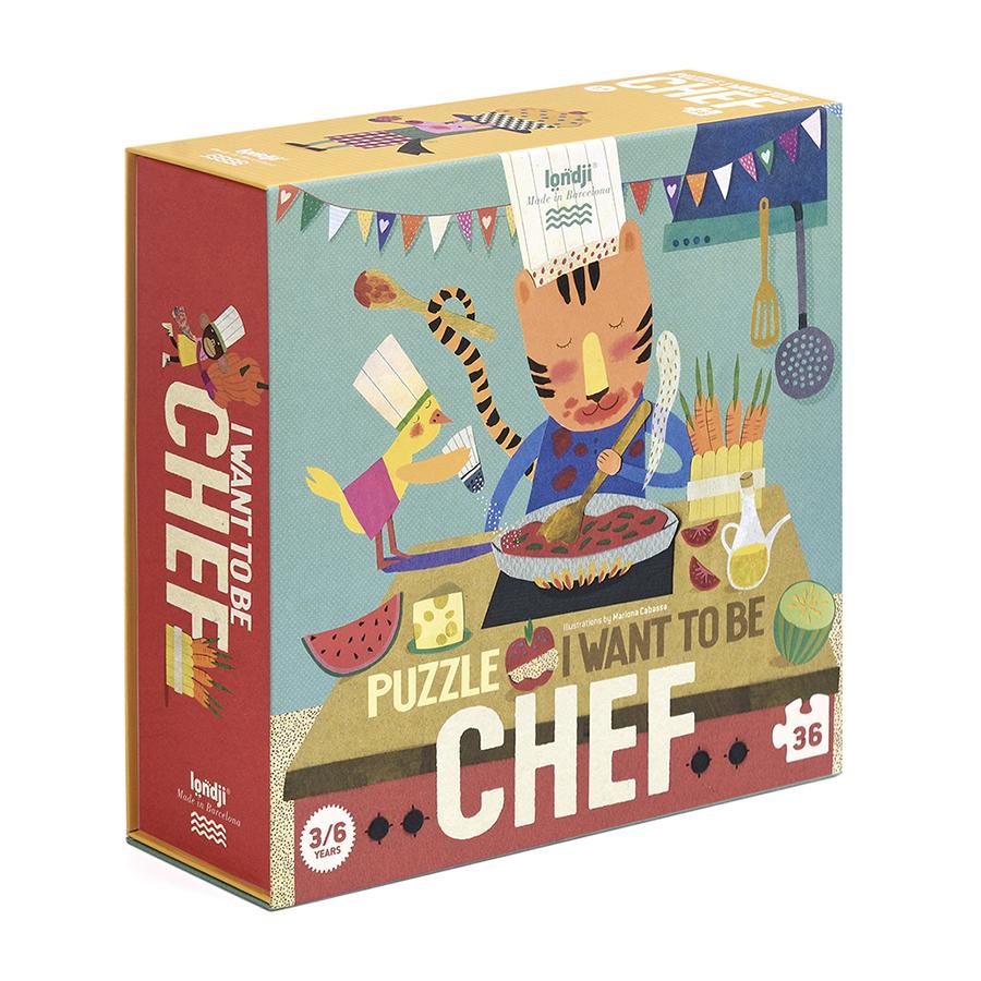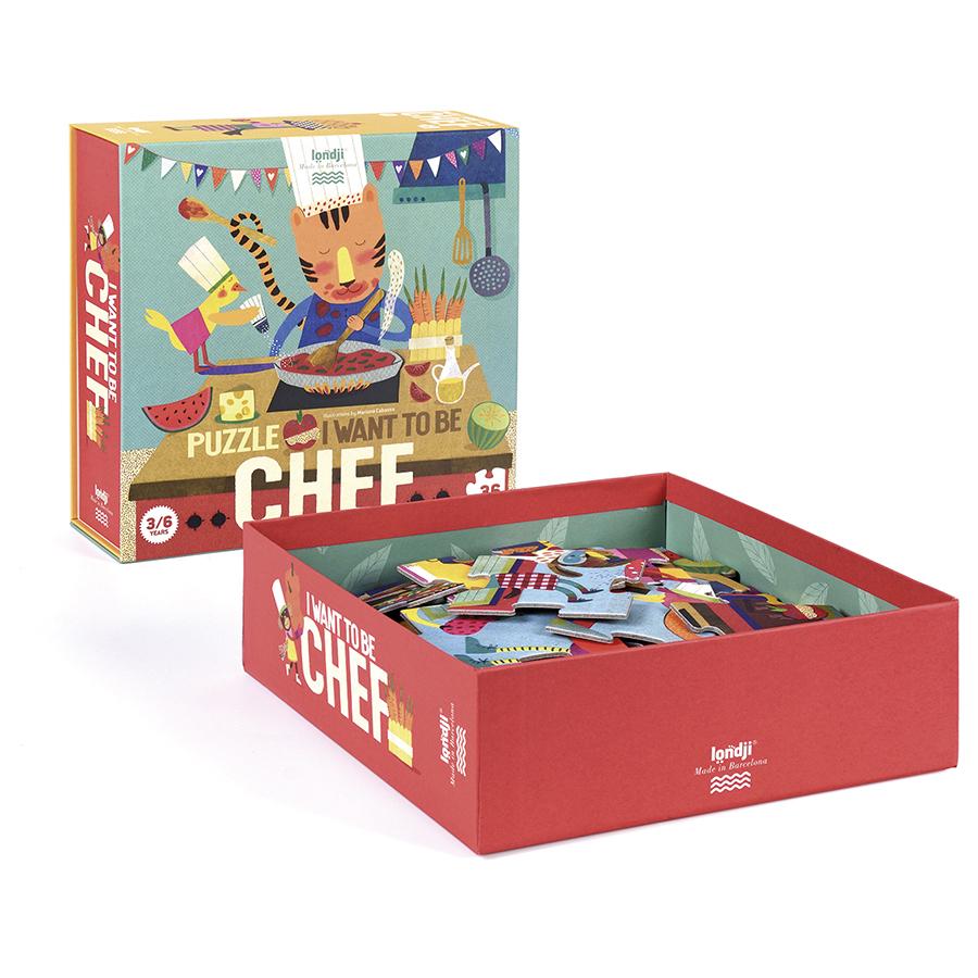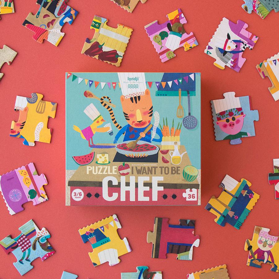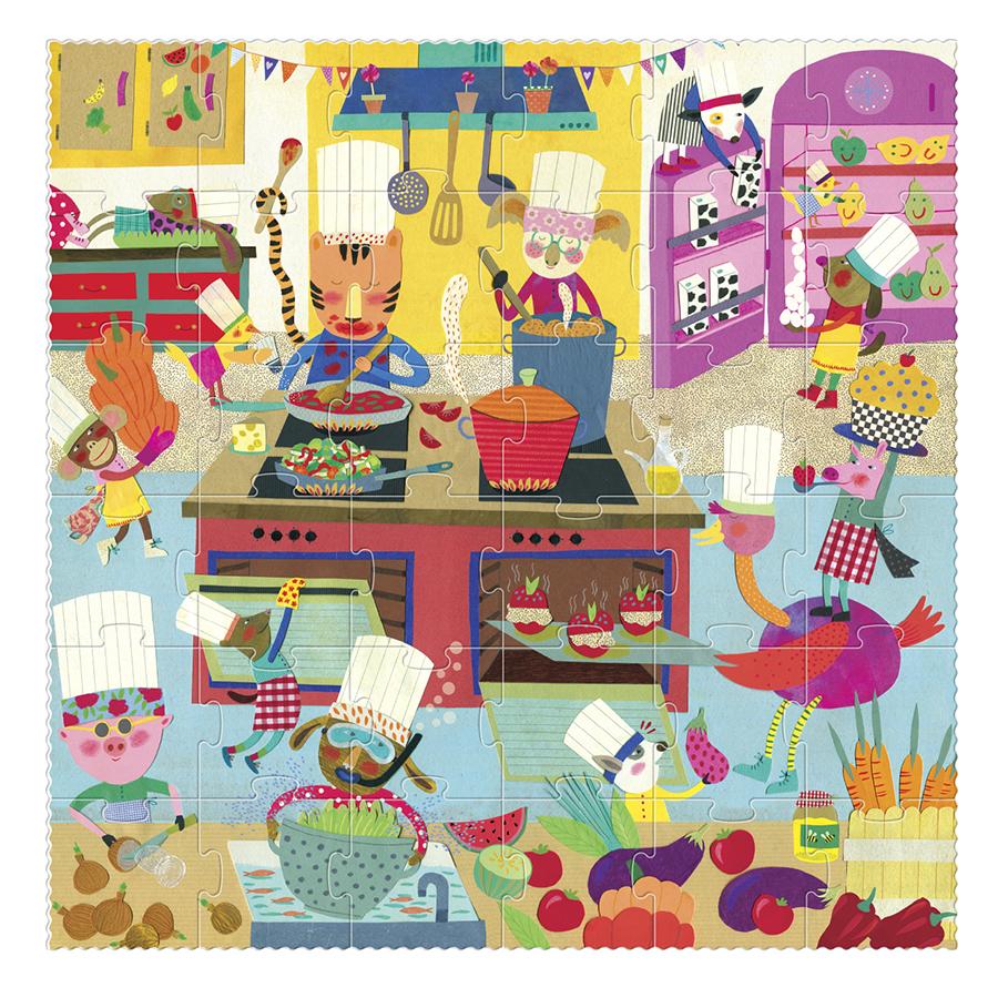 Σε αυτή την πολύχρωμη κουζίνα επίδοξοι σεφ όλων των ειδών μαγειρεύουν και ετοιμάζουν πεντανόστιμα πιάτα! Κατασκευασμένο από 100% ανακυκλωμένα υλικά και σχεδιασμένο στην Βαρκελώνη από την ισπανική εταιρία Londji. Με υπέροχα σκίτσα από την Mariona Cabassa. Το παζλ αποτελείται από 36 τεμάχια.