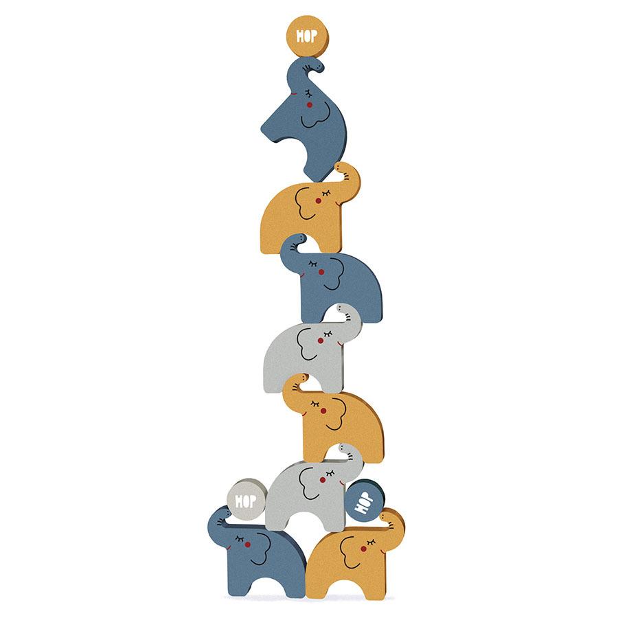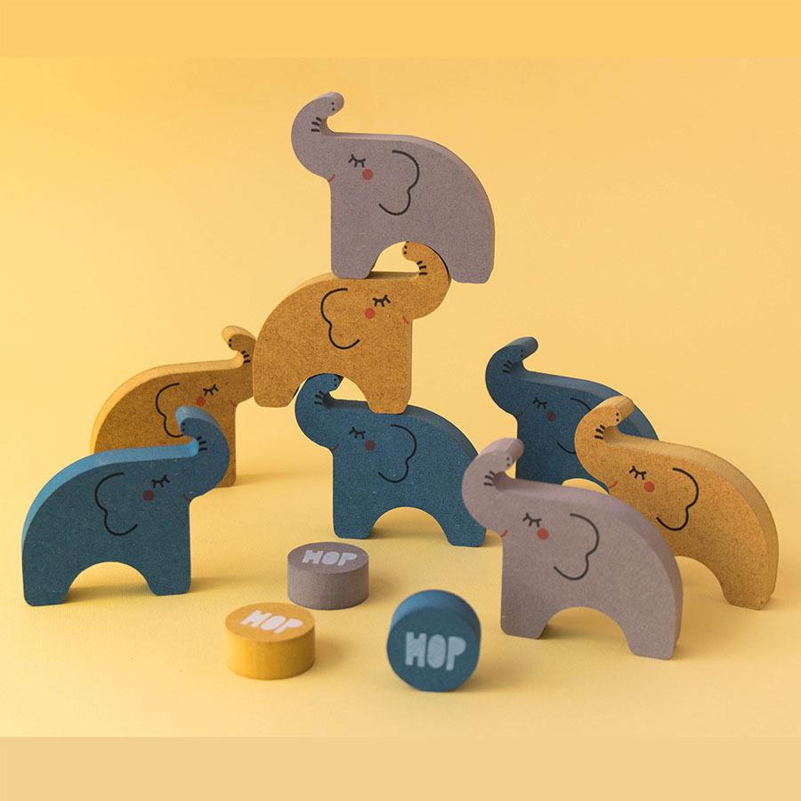 Τοποθετήστε έναν ελέφαντα, μετά βάλτε πάνω του μια μπάλα, μετά κι άλλον ελέφαντα και μετά… Προσέξτε μην τους αφήσετε να πέσουν! Για να δούμε ποιος από τους παίκτες θα αψηφήσει περισσότερο τους νόμους της βαρύτητας, θα αποκτήσει την καλύτερη ισορροπία και θα χτίσει τον ψηλότερο πύργο. Κατασκευασμένο από ανακυκλωμένο ξύλο και οργανικές βαφές.