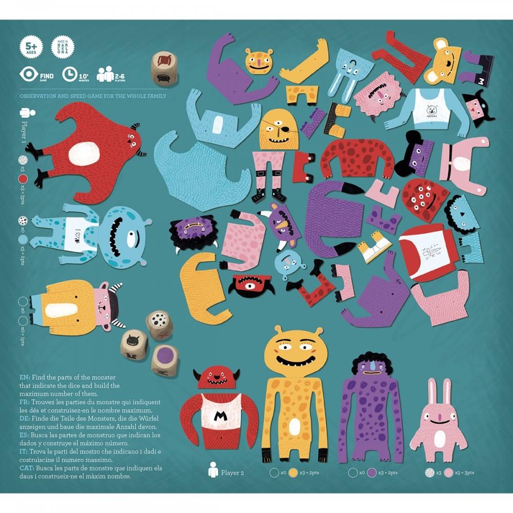 Μια φορά και έναν καιρό υπήρχε ένα τέρας … βασικά, πολλά τέρατα για να είμαστε ακριβείς! Τέρατα με διαφορετικά χρώματα, με κηλίδες, λέπια, ακόμα και τέρατα με διαφορετικό τρίχωμα… τέρατα κάθε λογής! Όσο περισσότερα καταφέρετε να φτιάξετε, τόσο το καλύτερο! Ένα διασκεδαστικό και πρωτότυπο παιχνίδι παρατηρητικότητας και σβελτάδας από την αγαπημένη μας ισπανική εταιρία Londji. Ανακατέψτε τις κάρτες, τοποθετήστε τις από την καλή πλευρά στο κέντρο του τραπεζιού, ρίξτε τα ζάρια χρώματος, υφής και μελών τεράτων, που αντιστοιχούν στο επίπεδο δυσκολίας που θέλετε και ξεκινήστε το παιχνίδι! Προσπαθήστε να εντοπίσετε και να αρπάξετε πρώτοι το κομμάτι που πληροί όλες τις προδιαγραφές της ζαριάς! Όσο πιο γρήγοροι είστε, τόσο περισσότερα τερατάκια θα καταφέρετε να φτιάξετε. Στο τέλος του παιχνιδιού, κάθε τερατάκι σας δίνει συγκεκριμένους πόντους αναλόγως με τα χαρακτηριστικά του. Νικητής του παιχνιδιού είναι ο παίκτης με τους περισσότερους πόντους! Περιεχόμενα: 20 κομμάτια κεφαλιών (σε 5 χρώματα και 4 υφές), 20 κομμάτια σώματος (σε 5 χρώματα και 4 υφές), 20 κομμάτια ποδιών (σε 5 χρώματα και 4 υφές), 4 ξύλινα ζάρια (χρώματος, υφών, και 2 μελών ανάλογα με το επίπεδο δυσκολίας).