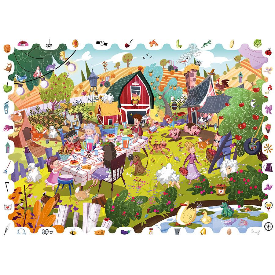 Παζλ εξαιρετικής ποιότητας, 108 κομματιών με θέμα «Η Φάρμα». Συνθέστε το παζλ και μεταμορφωθείτε σε έναν μικρό ντετέκτιβ, χρησιμοποιώντας τον ξύλινο μεγεθυντικό φακό για να βρείτε μέσα στην εικόνα όλα τα αντικείμενα που βρίσκονται στο πλαίσιο του παζλ . Ένα παιχνίδι που εξάπτει την περιέργεια και αναπτύσσει την παρατηρητικότητα των παιδιών. Διαστάσεις παζλ: 50 x 70 εκ.