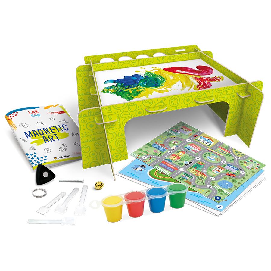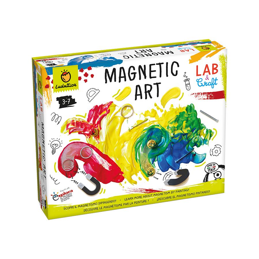 Ένα φανταστικό παιχνίδι που συνδυάζει τη παρατήρηση των ιδιοτήτων των μαγνητών – ικανών να έλκουν και να μετακινούν αντικείμενα – με τη καλλιτεχνική εμπειρία της ζωγραφικής, δίνοντας έτσι ζωή σε έργα τέχνης που είναι πάντα απρόβλεπτα και μοναδικά! Ένα πραγματικά ιδιαίτερο παιχνίδι από τη νέα φανταστική σειρά της Ludattica, «Lab & Craft» που εισάγει τα παιδιά στην έννοια του ηλεκτρομαγνητισμού, μέσω της τέχνης και της δημιουργίας. Συμπεριλαμβάνεται ένα εγχειρίδιο γεμάτο από διασκεδαστικές, ενδιαφέρουσες ιδέες και δραστηριότητες που θα κάνουν το παιχνίδι μια μοναδική μαθησιακή εμπειρία! Το παιχνίδι έχει υλοποιηθεί σε συνεργασία με το μουσείο των παιδιών στη Ρώμη «EXPLORA», ώστε να προωθήσει την εκμάθηση των S.T.E.M. Περιεχόμενα: 1 συναρμολογούμενο τραπεζάκι/βάση, μαγνήτης, 3 μεταλλικά αντικείμενα (ράβδος, δακτύλιος και κουδουνάκι), 2 κάρτες δραστηριοτήτων, 4 χρώματα τέμπερας, 10 λευκά φύλλα, 4 πλαστικά κουταλάκια, εκπαιδευτικό εγχειρίδιο οδηγιών. Διαστάσεις συσκευασίας: 34.5 x 28 x 8.5 εκ.