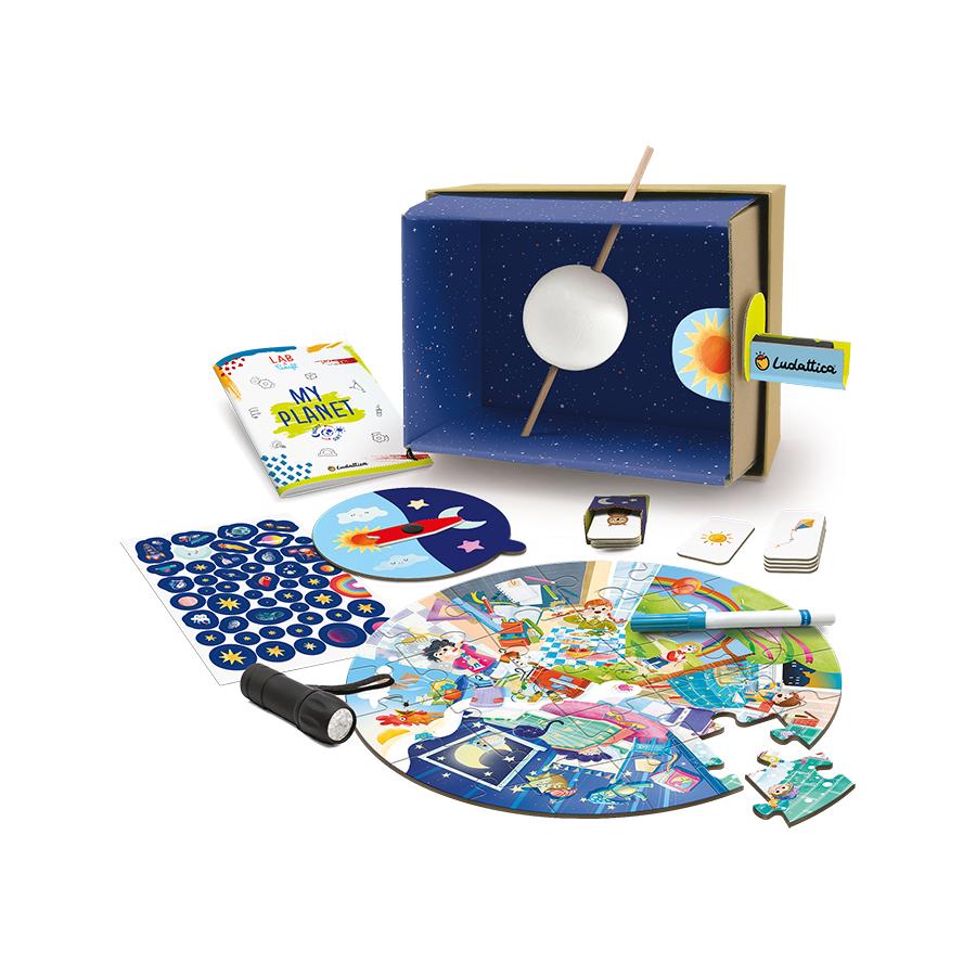 Κατασκευάστε τη Γη και κάντε την να περιστραφεί στο διάστημα! Ένα πρωτοποριακό παιχνίδι από τη νέα φανταστική σειρά της Ludattica, «Lab & Craft» που εισάγει τα παιδιά στις έννοιες τις περιστροφής του πλανήτη μας και των φάσεων του κύκλου της ημέρας-νύχτας. Συμπεριλαμβάνεται ένα εγχειρίδιο γεμάτο από διασκεδαστικές, ενδιαφέρουσες ιδέες και δραστηριότητες που θα κάνουν το παιχνίδι μια μοναδική μαθησιακή εμπειρία! Πέρα από το κουτί-σύμπαν, με τη Γη, και το φακό που δρα σαν Ήλιος, ανακαλύψτε το παζλ ημερήσιων δραστηριοτήτων, τις κάρτες συσχέτισης, τα αυτοκόλλητα και πολλά άλλα! Το παιχνίδι έχει υλοποιηθεί σε συνεργασία με το μουσείο των παιδιών στη Ρώμη «EXPLORA», ώστε να προωθήσει την εκμάθηση των S.T.E.M. Περιεχόμενα: 1 κουτί-σύμπαν, 1 σφαίρα πλανήτη για διακόσμηση, 1 ξύλινη σανίδα, 1 φακός, 18 κάρτες ημέρας και νύχτας, 1 στρογγυλό παζλ διαμέτρου 32 εκ., 1 σβούρα, 1 μαρκαδόρος, αυτοκόλλητα, εκπαιδευτικό εγχειρίδιο οδηγιών. Διαστάσεις συσκευασίας: 27.5 x 21 x 14 εκ.