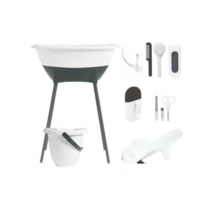 Το σετ περιλαμβάνει βρεφική μπανιέρα, βάση μπανιέρας, κουβάς, κάθισμα μπάνιου, σετ μανικιούρ, χτένα, βούρτσα.