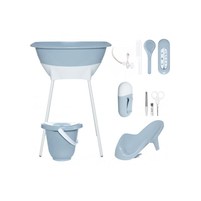Το σετ περιλαμβάνει βρεφική μπανιέρα, βάση μπανιέρας, κουβάς, κάθισμα μπάνιου, σετ μανικιούρ, χτένα, βούρτσα.
