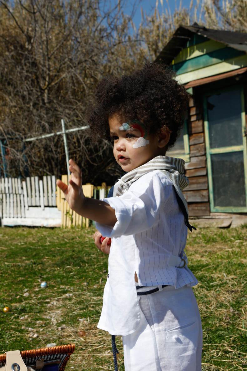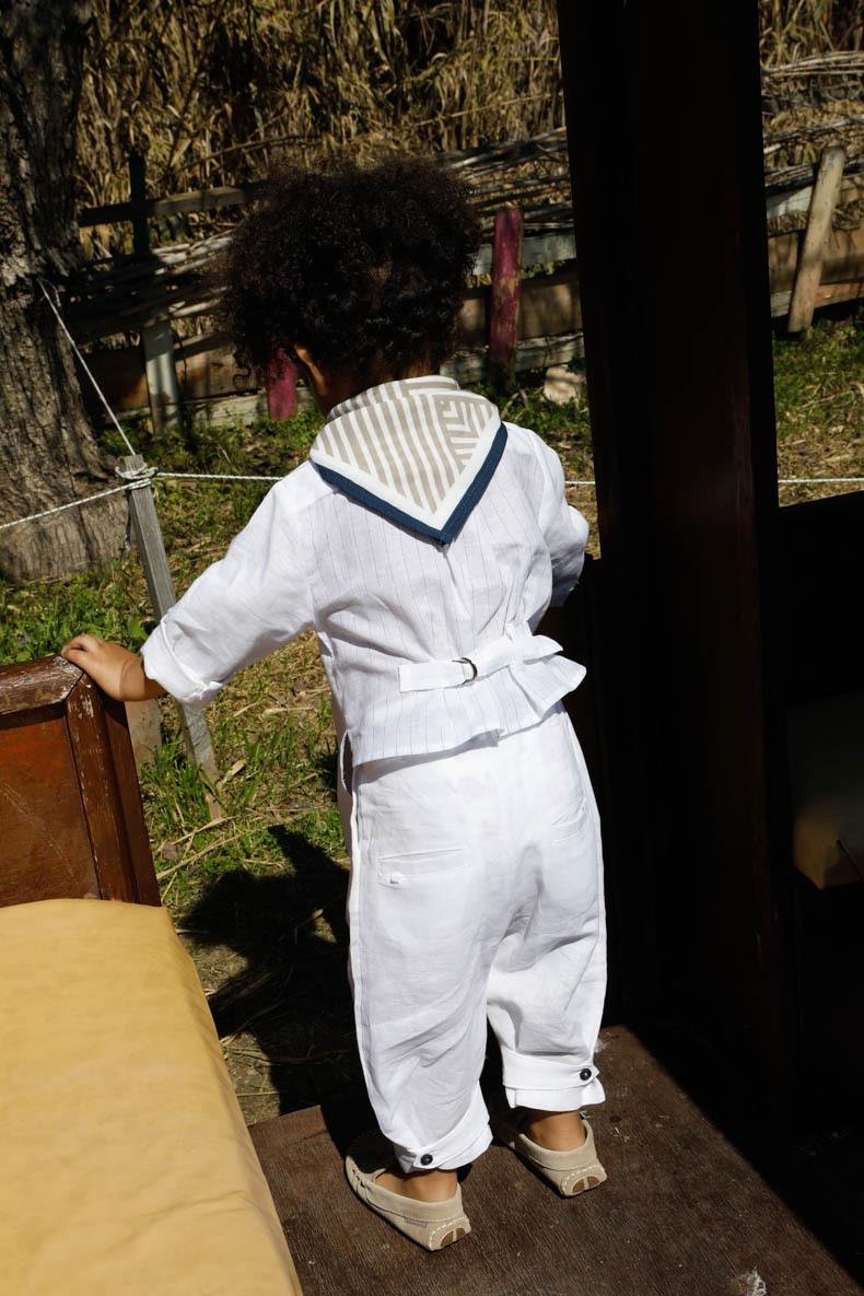 Ο Manolis είναι ένα λευκό σετ βάπτισης με μπλε λεπτομέρειες. Πουκάμισο μάο λευκό 100% λινό με ιδιαίτερο σχέδιο στην πλάτη από 100% λευκό cotton ύφασμα με μπλε ρίγα. Παντελόνι λευκό λινό 100% με μπλε κορδόνι για ζώνη. Φουλάρι με printed σχέδιο από 100% cotton. Αξεσουάρ: δερμάτινα μοτίφ. Καπέλο καβουράκι καφέ.