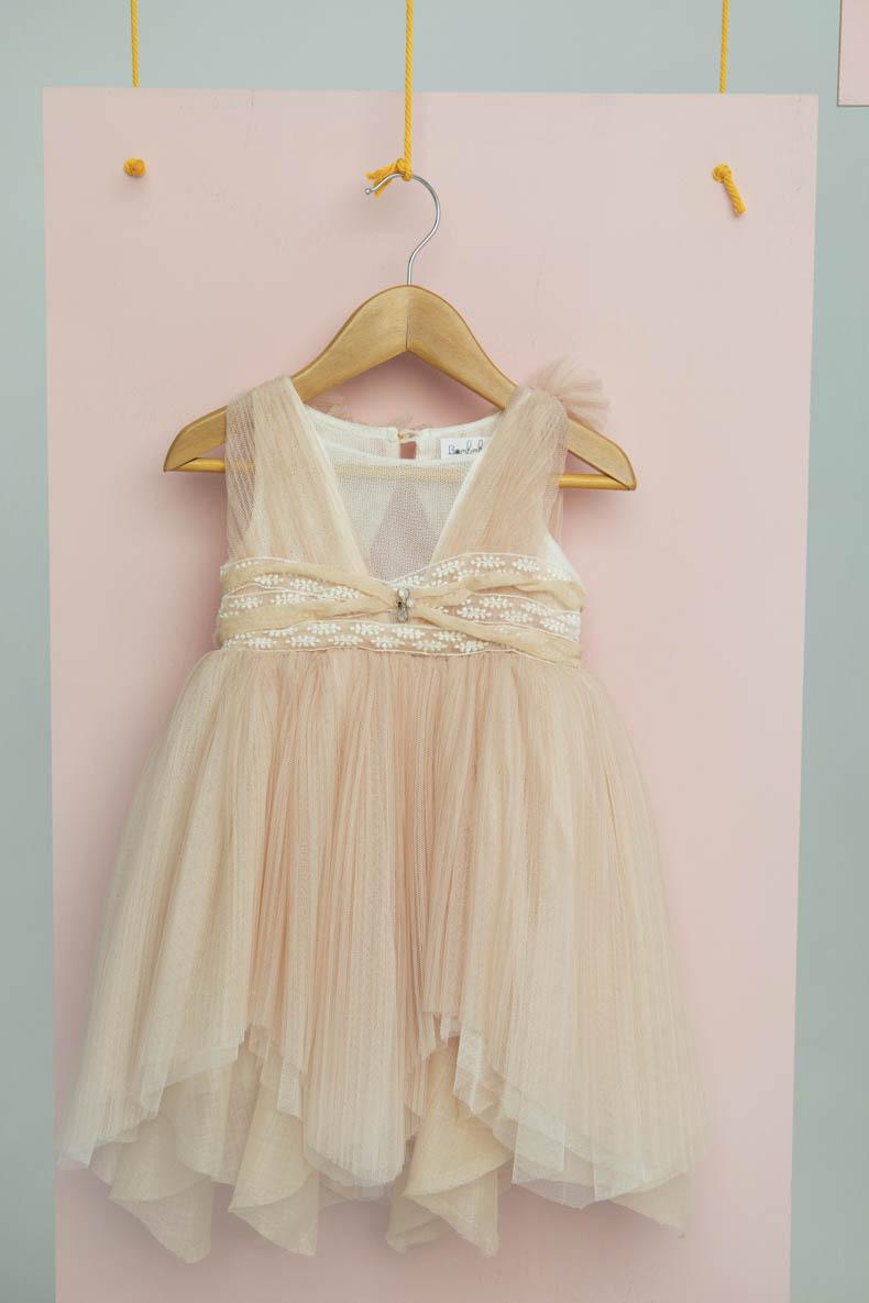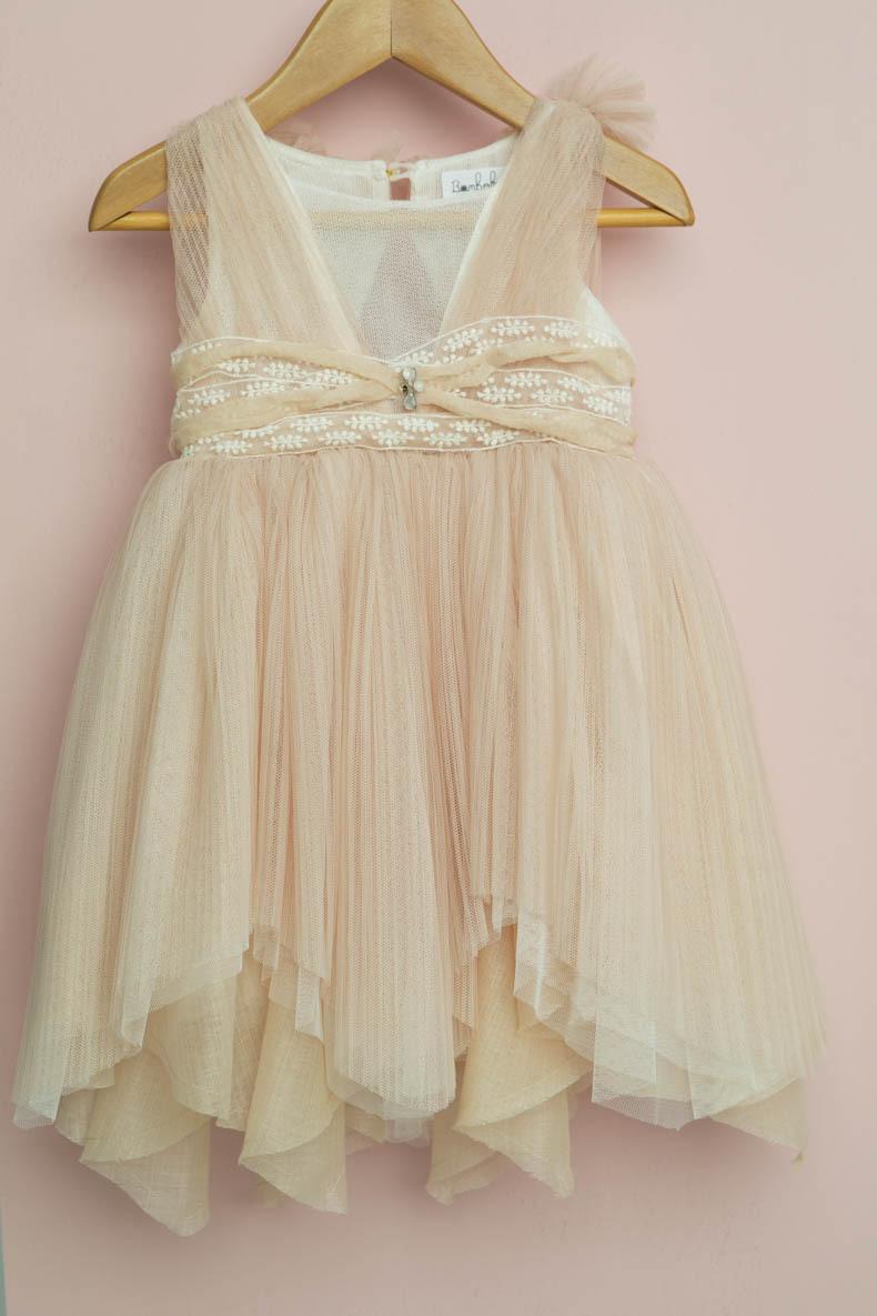 Nude φόρεμα με πλισσέ τούλι σε μποέμ boho ύφος.Ιδιαίτερο μπούστο με V και ανοικτή πλάτη. Φούστα ανάλαφρη από πλισσέ τούλια και βαμβακερή φόδρα. Αξεσουάρ: Ιδιαίτερο στεφανάκι με εκρού και λιλά λουλούδια. Σύνθεση υφασμάτων: Plisse tulle 100% Ιταλίας, Cotton Tulle Γαλλίας, Voual 100% Γαλλίας.
