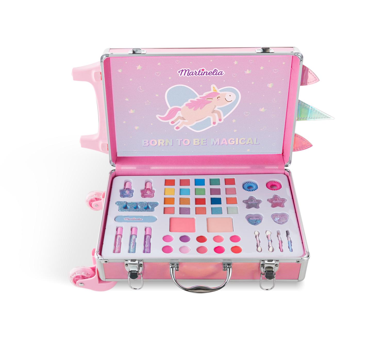 Ενθουσιάστε τις μικρές σας πριγκίπισσες, χαρίζοντάς τους το υπέροχο παιδικό σετ Martinelia LITTLE UNICORN Carry on makeup case by FOLIA COSMETICS – το υπέροχο βαλιτσάκι με ασημένιες μεταλλικές λεπτομέρειες που περιλαμβάνει 20 σκιές, 2 υδροδιαλυτά βερνίκια νυχιών, 2 ρουζ και 15 lip gloss, 1 λίμα, 1 διαχωριστή δαχτύλων, 2 spiral κοκαλάκια, 3D στικέρς και 6 πινέλα μακιγιάζ.