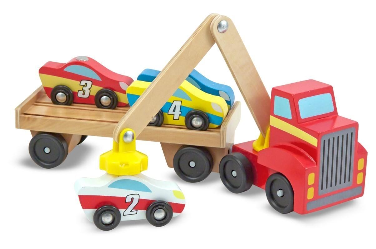 Ξύλινο φορτηγό φόρτωσης και μεταφοράς αυτοκινήτων. Περιλαμβάνει φορτηγό με trailer και μαγνητικό γερανό και 4 πολύχρωμα αυτοκινητάκια. Ενισχύει τη λεπτή κινητικότητα και τον συντονισμό ματιών-χεριών. Κατάλληλο για παιδιά άνω των 3 ετών.