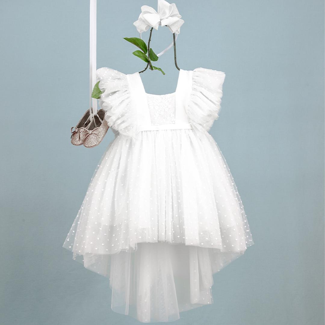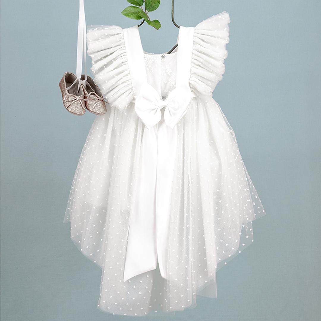 Michelle-9352: Η Michelle είναι ένα αέρινο ασύμμετρο εκρού φόρεμα βάπτισης που θα σας καταπλήξει. Τα ιδιαίτερα βολάν στα μανίκια από τούλι εξαιρετικής ποιότητας προσδίδουν μία εκλεπτυσμένη soft αίσθηση. Η ουρά στο πίσω μέρος του προσδίδει  αρχοντιά και ο φιόγκος από βουάρ σατέν το ολοκληρώνει. Η exclusive στέκα με τους περίτεχνους φιόγκους σας δίνει μία τέλεια επιλογή.