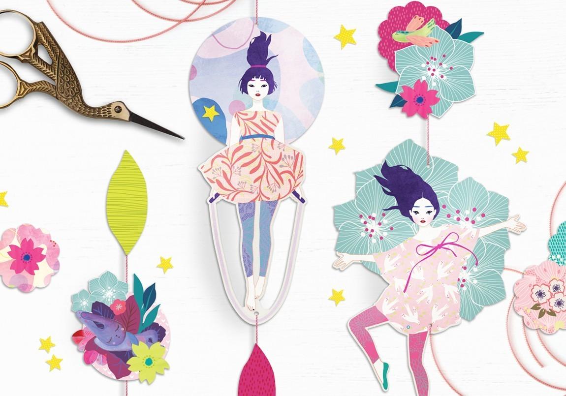 Πλήρες σετ για να συνθέσετε πολύ απλά, όμορφες γιρλάντες με θέμα “Ανοιξιάτικο Μπαλέτο” ! Θα βρείτε δεκάδες στοιχεία, κούκλες, λουλούδια και φύλλα για να κρεμάσετε στο σύρμα, χρησιμοποιώντας τα αυτοκόλλητα που παρέχονται.