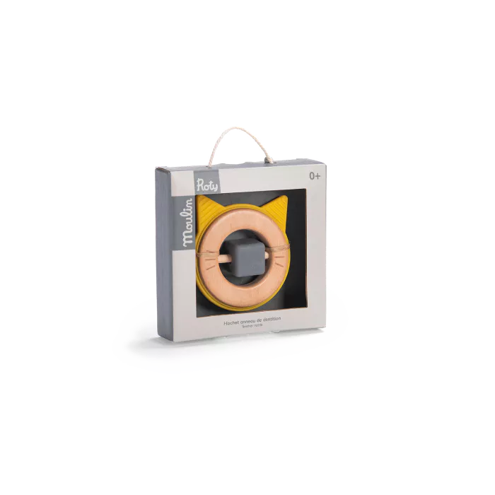 Κρίκος οδοντοφυΐας σε σχήμα γάτου από την συλλογή Les Moustaches με έντονα χρώματα και ανάγλυφες επιφάνειες που διεγείρουν τις αισθήσεις του μωρού. Κατασκευασμένο από φυσικό ξύλο οξιάς και μαλακή σιλικόνη ανακουφίζει τα ούλα του μωρού κατά την περίοδο της οδοντοφυΐας. Το σχήμα του είναι μελετημένο ώστε να είναι εύκολο στο κράτημα από τα λιλιπούτια χεράκια.