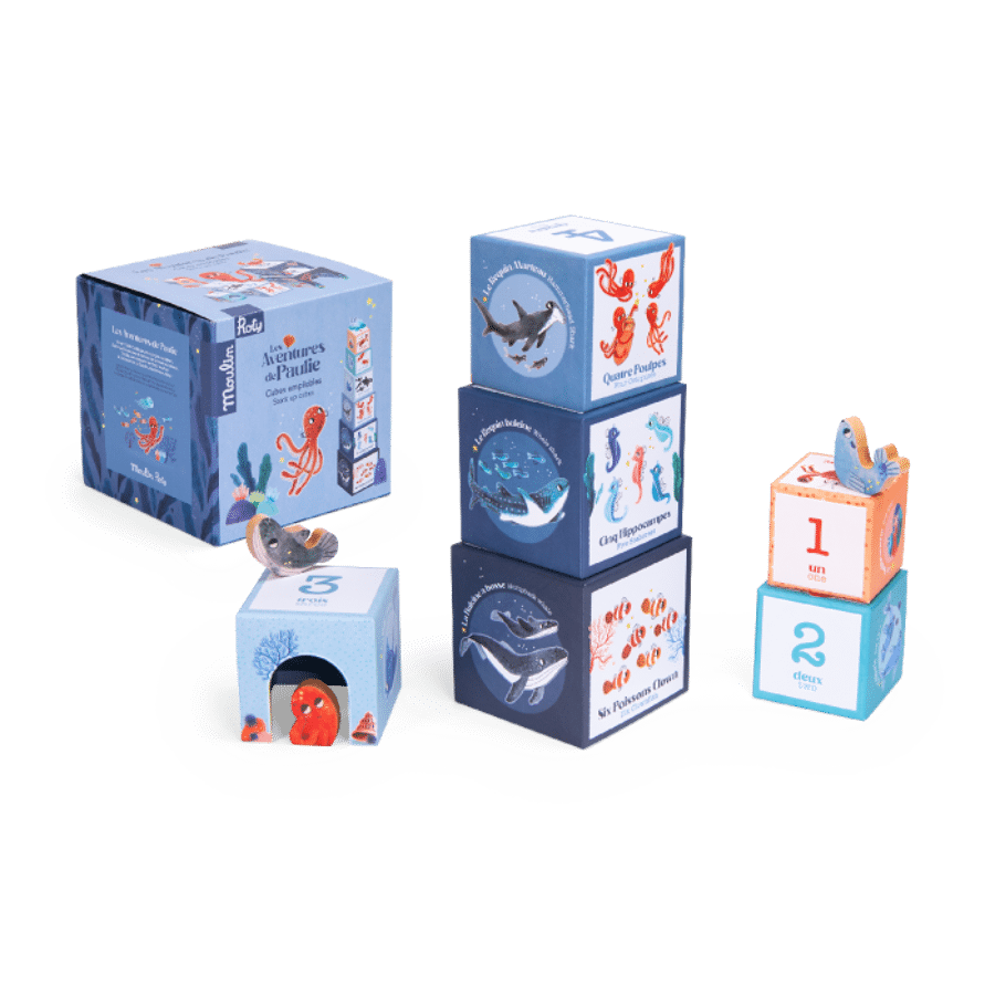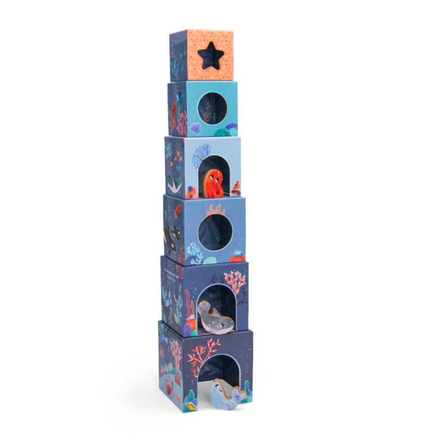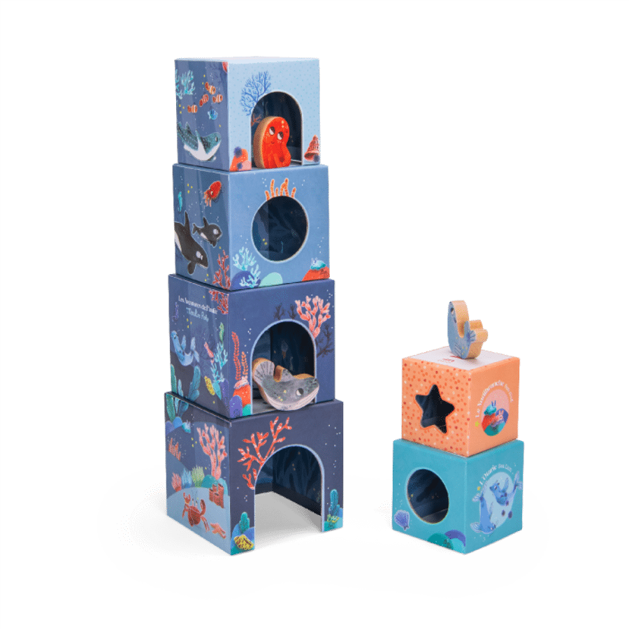 Έξι κύβοι στοίχισης με 3 ξύλινους χαρακτήρες προσκαλούν το μωρό να παίξει κάτω από τον ωκεανό. ‘Ομορφα εικονογραφημένα σχέδια προσφέρουν διαφορετική μάθηση για διασκέδαση ανάλογα με την ηλικία: δημιουργία πύργου, εκμάθηση μέτρησης, ανακάλυψη θαλάσσιων ζώων…