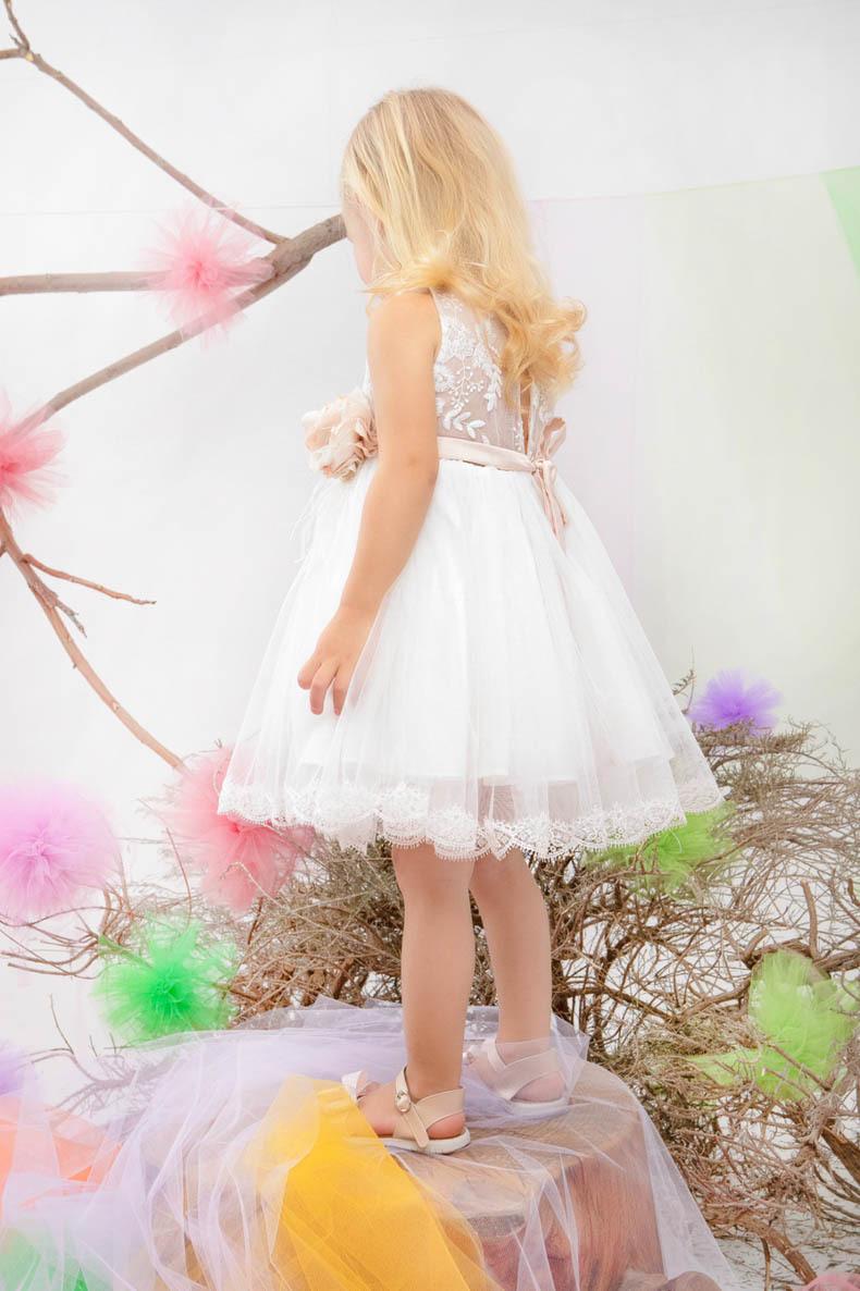 Η Myrto είναι ένα έκρου αέρινο τουλινο φόρεμα με δαντελα στο μπούστο. στο φόρεμα ξεχωριζει η λεπτή old pink ζώνη με off white δαντελα και χειροποιητα λουλούδια σε nude και old pink αποχρώσεις με Swarovski. Περιλαμβάνει κορδέλα για το κεφαλι.