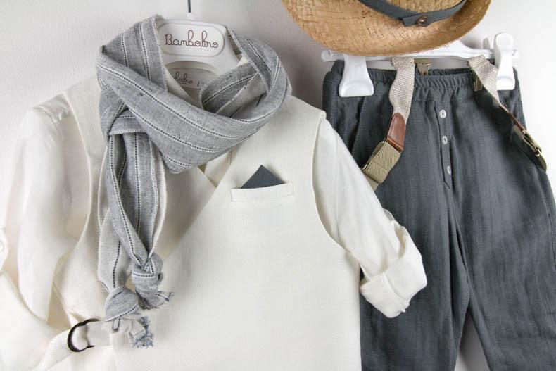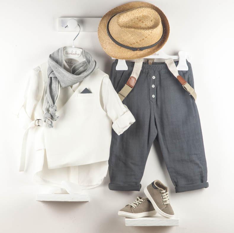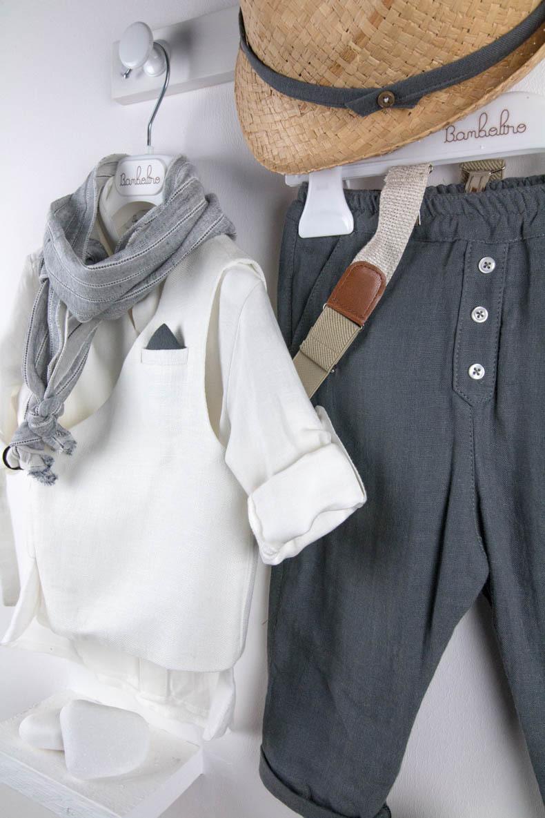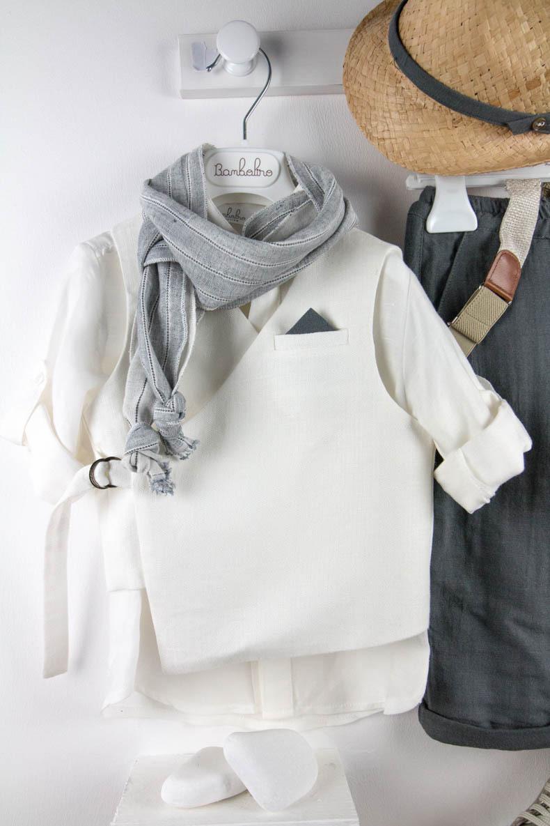 Νέος συνδυασμός βάπτισης με μοντέρνες πινελιές είναι ο Noah. Συνδυάζει το μολυβί παντελόνι που είναι διακοσμημένο με εκρού κουμπιά με το εκρού λινό πουκάμισο και με το εκρού σταυρωτό γιλέκο εξαιρετικής ποιότητας. Αξεσουάρ είναι οι τιράντες, το ριγέ γκρι φουλάρι και το καβούρι του.