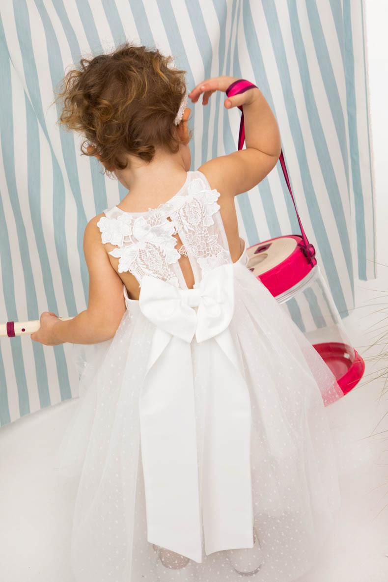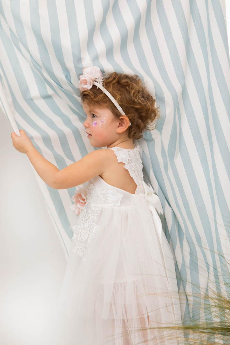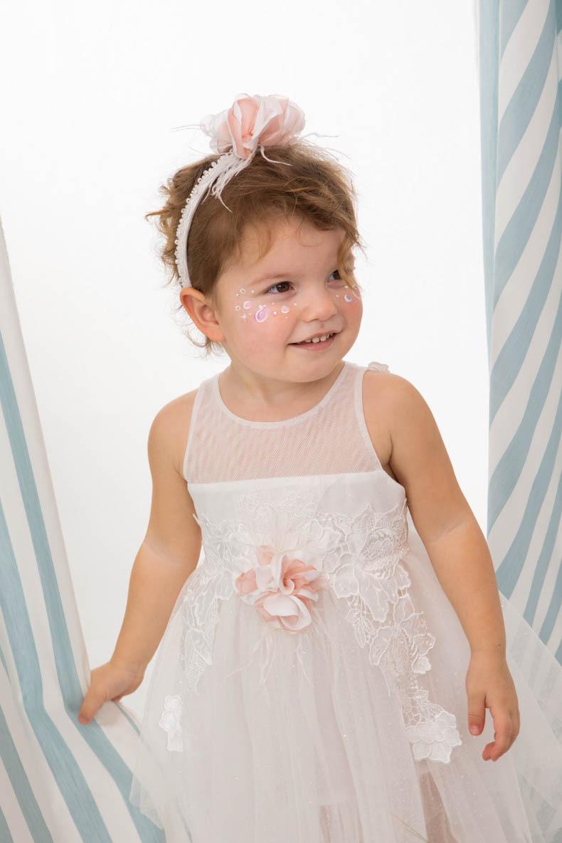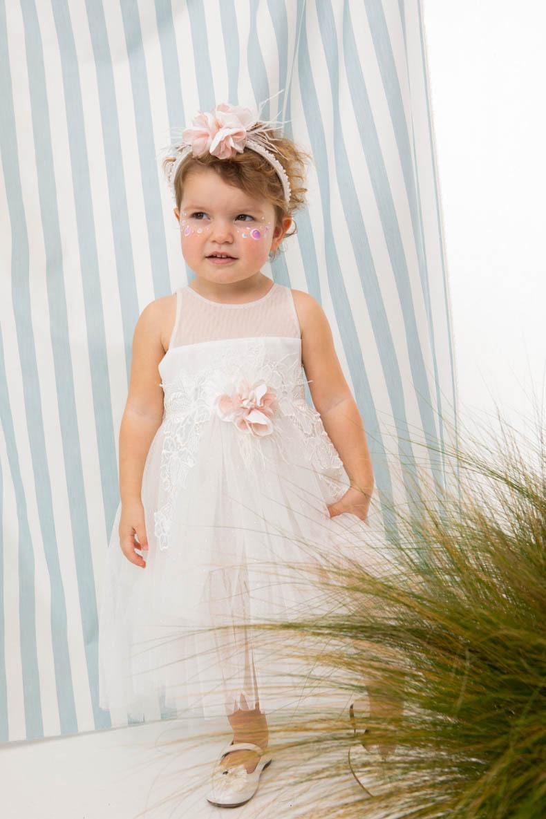 Εκρού φόρεμα με ασσύμετρη φούστα με στολισμό από χειροποίητα λουλούδια και κεντημένη δαντέλα. Chantilly στο μπούστο και σε ένα μέρος της φούστας. Αξεσουάρ: Στέκα με πέρλες, λουλούδια και πούπουλο. Σύνθεση υφάσματος: Glitter Tulle Γαλλίας, Cotton tulle Γαλλίας, Δαντέλα chantilly Γαλλίας, 100% Cotton. Ελληνικής ραφής.