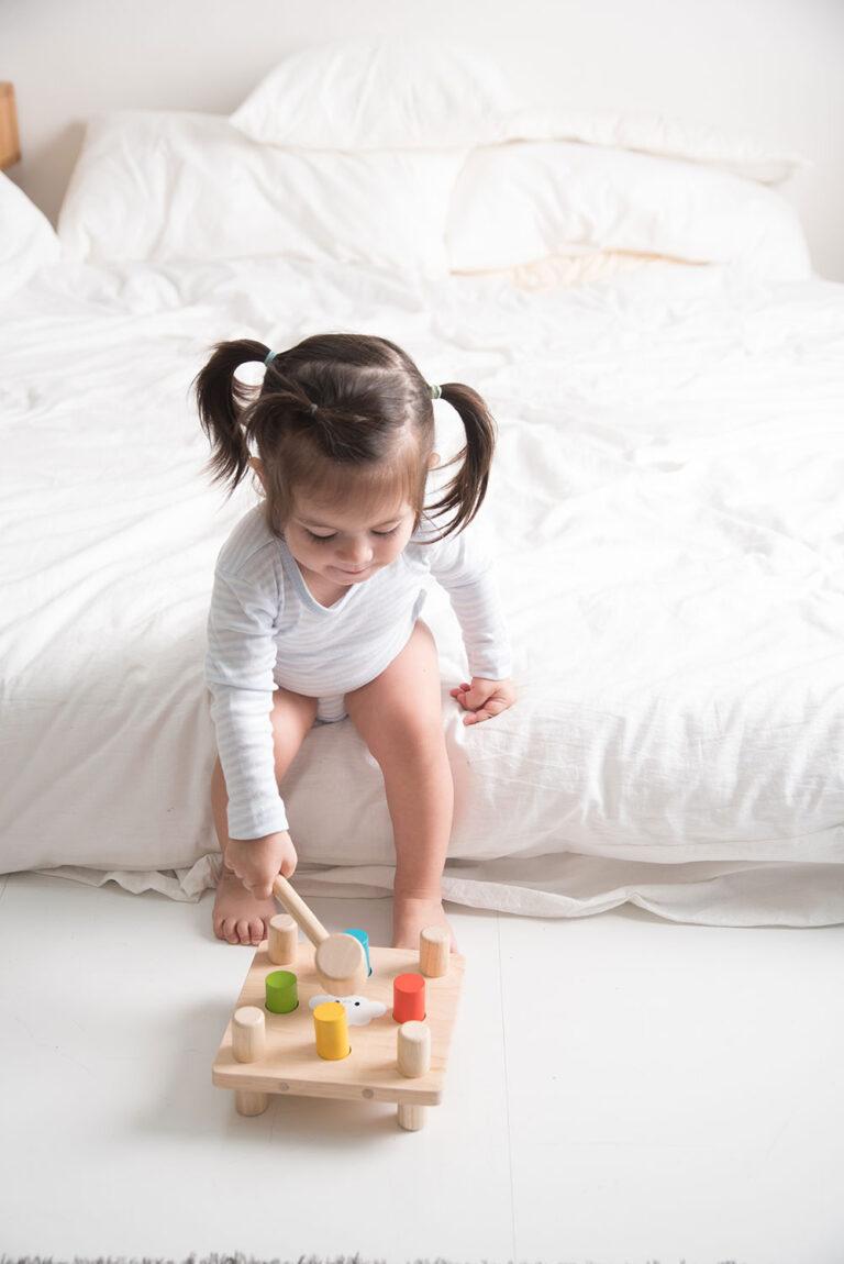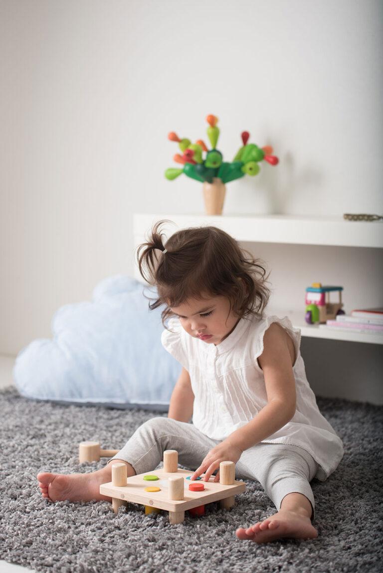 Τέσσερα χρωματιστά ξύλινα καρφιά χτυπιούνται με ξύλινο σφυράκι πάνω στον πάγκο μέχρι να περάσουν από την άλλη μεριά. Αναποδογυρίζοντας τον πάγκο, επαναλαμβάνεται η διαδικασία. Στην μια πλευρά είναι ζωγραφισμένος ένας ήλιος και στην άλλη ένα συννεφάκι. Διαστάσεις: 17.5 x 17.5 x 8.5 cm