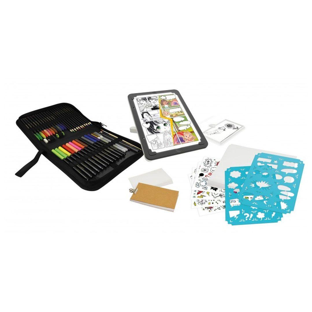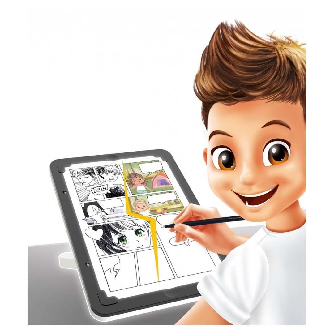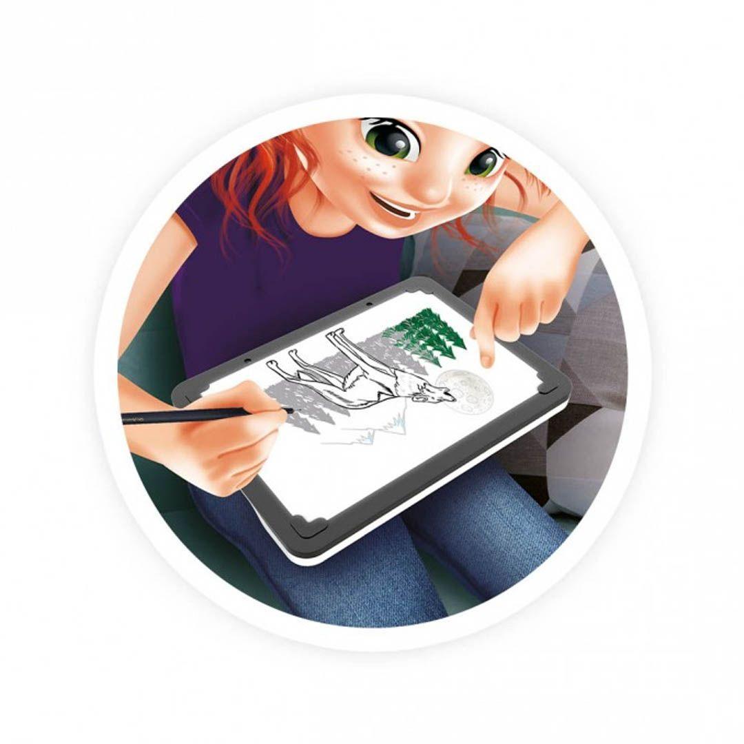 ΤΑBLET 3 σε 1 .Φωτίστε το φύλλο σας για αποτύπωση και ζωγραφική , και )με τη βοήθεια στένσιλ φτιάξτε και ζωγραφίστε πάνω σε κόμικς .Στην συνέχεια τοποθετήστε τον αντάπτορα και διασκεδάστε αναπαράγοντας σχεδόν πανομοιότυπες ζωγραφιές και μετά ζωντανέψτε τις! Η βάση είναι ρυθμιζόμενη και αφαιρείται για να  σχεδιάσετε σε επίπεδο τραπέζι,  με κλίση ή ακόμη και στο αυτοκίνητο. Περιλαμβάνεται: ένα κιτ με όλα τα σχέδια και τα υλικά ,μολύβι ακουαρέλας, γόμα, χάρτινα μολύβια, στένσιλ, λευκά φύλλα και αυτοκόλλητα φύλλα.