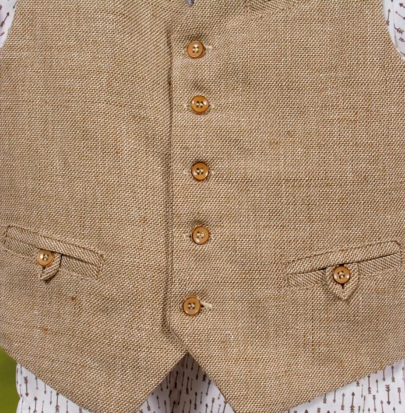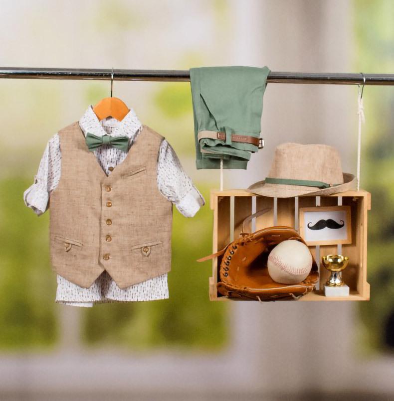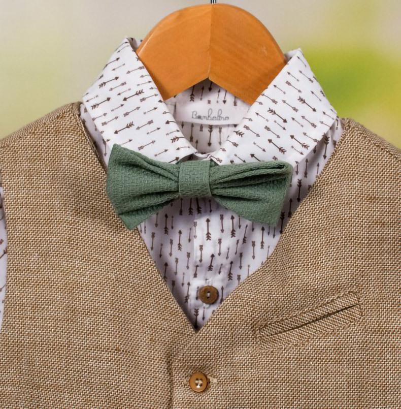 Αποτελείται από green cotton παντελόνι, λευκό πουκάμισο με print βέλη και ψάθινο classic γιλέκο με κουμπιά. Απαραίτητα αξεσουάρ το ψάθινο καπέλο, η ταμπά δερμάτινη ζώνη και το green cotton παπιγιόν.