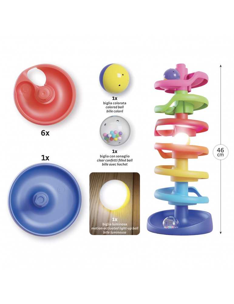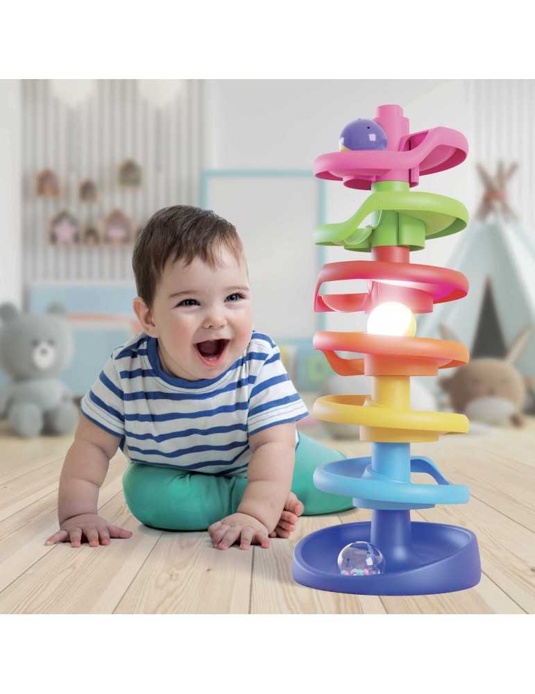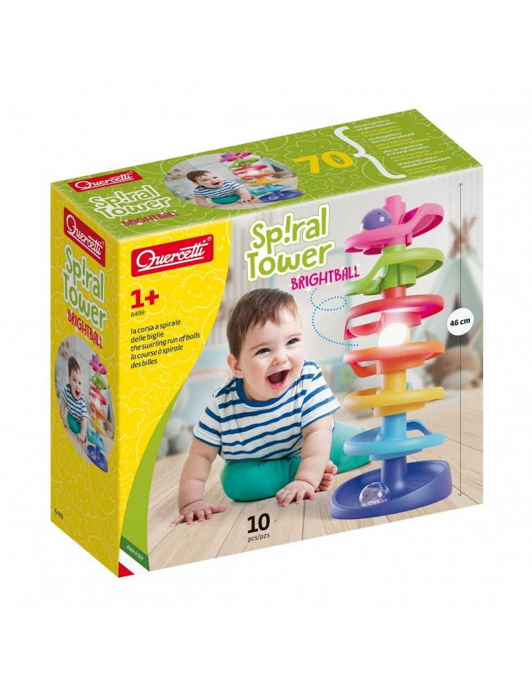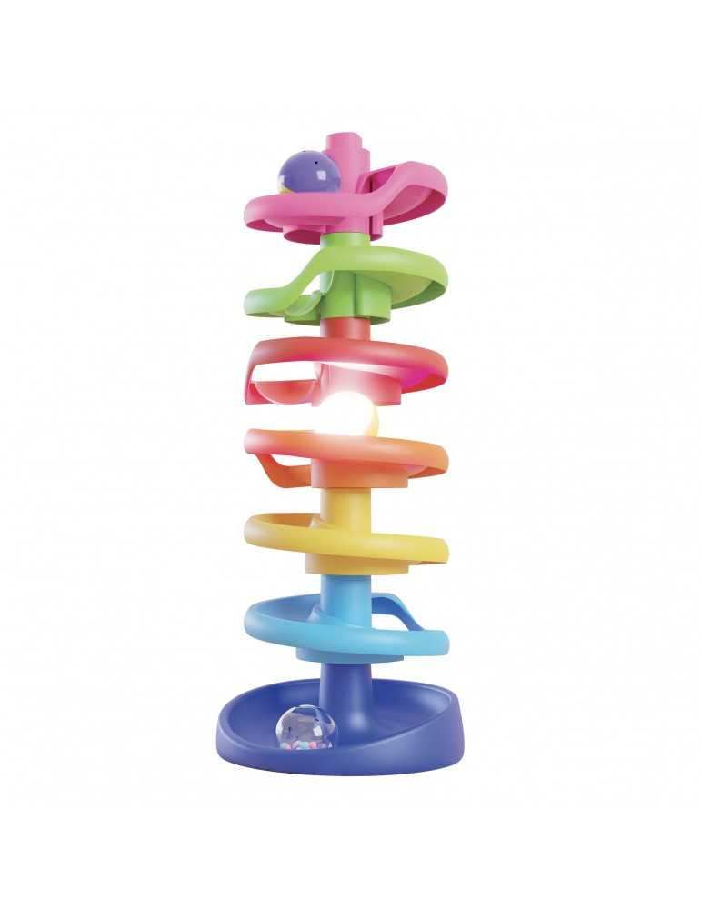 Πύργος Σπείρας Brightball, κατάλληλος για παιδιά από τον πρώτο χρόνο της ζωής τους. Κάθε επίπεδο είναι κατασκευασμένο σε διαφορετικό χρώμα, επιτρέποντας στα παιδιά να εξασκήσουν την αναγνώριση των χρωμάτων. Το σετ αναπτύσσει τις χειρωνακτικές ικανότητες, καθώς κατά την διάρκεια του παιχνιδιού, τα παιδιά μπορούν να πιάσουν μεγάλα μπαλάκια που κυλούν προς τα κάτω. Είναι κατασκευασμένο από ανθεκτικό, μη σπαστό πλαστικό και έχει στρογγυλεμένες γωνίες, ασφαλείς για τους μικρούς χρήστες. Η διασκέδαση ενισχύεται με το κυλιόμενο, φωτεινό μπαλάκι