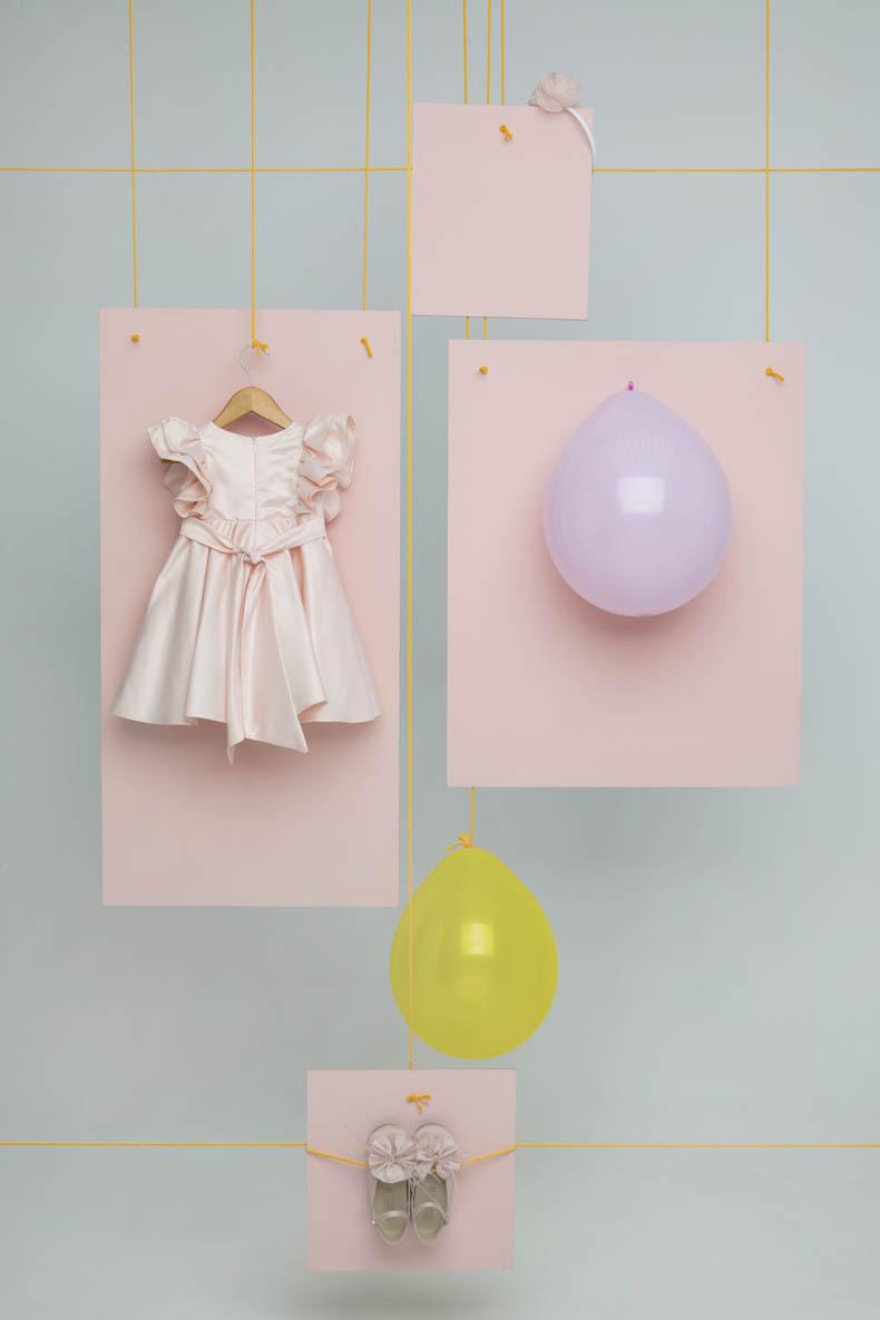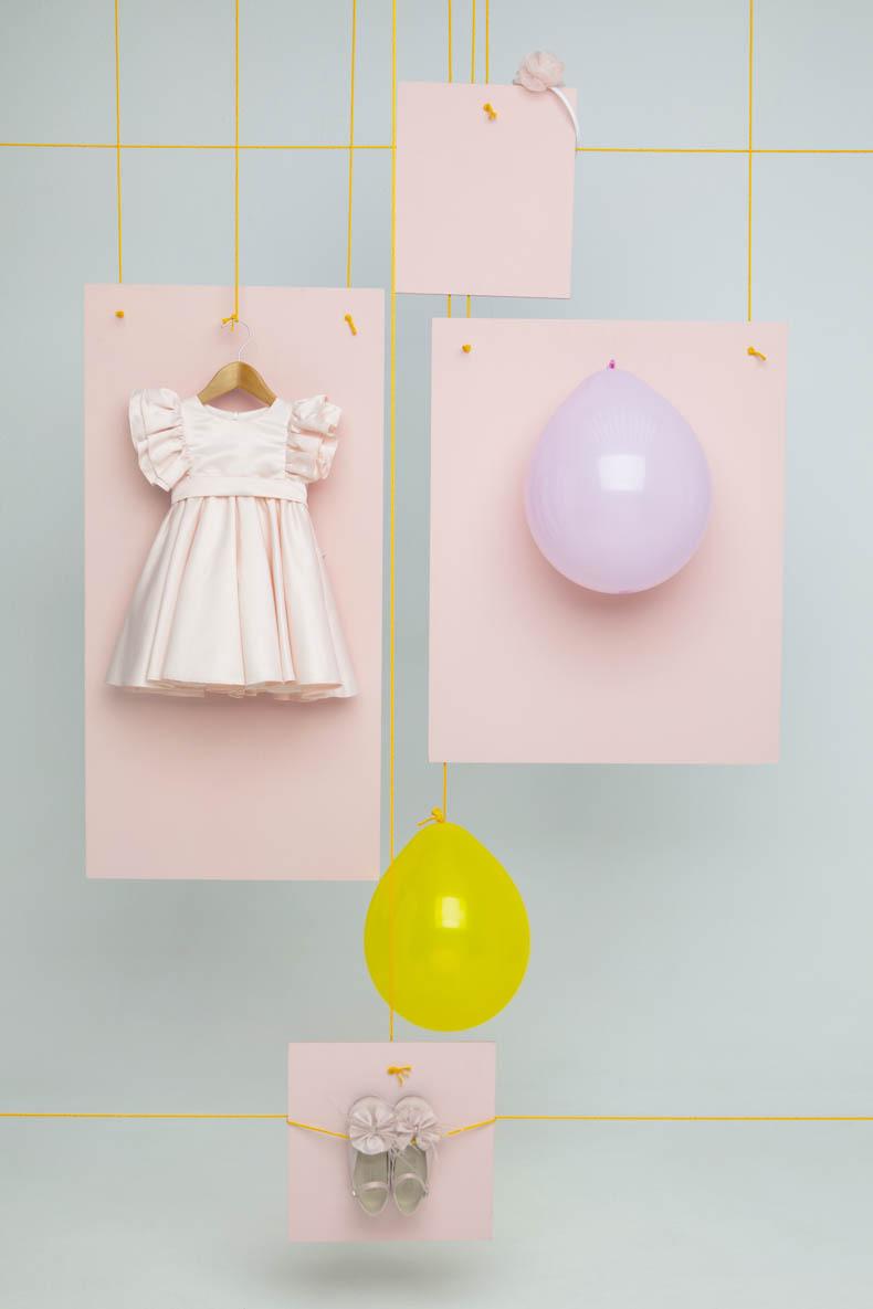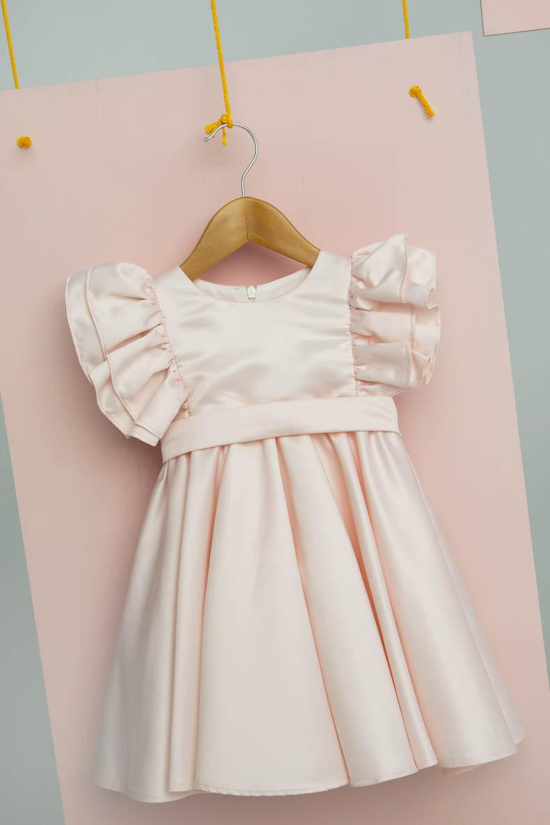 Ροζ σατέν φόρεμα σε all time classic ύφος με βολάν στα μανίκια και a-line πατρόν στην φούστα. Αξεσουάρ: Στέκα με λουλούδια. Σύνθεση υφασμάτων: Κρεπ-σατέν 100% Ιταλίας, Cotton 100%. Ελληνικής ραφής.