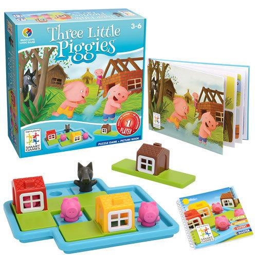 Μια φορά κι έναν καιρό… Μπορείτε να βοηθήσετε τα τρία μικρά γουρουνάκια να χτίσουν τα σπίτια τους; Μπορείτε να τα φτιάξετε έτσι ώστε τα γουρουνάκια να παίζουν έξω από αυτά; Εάν εντοπίσετε το λύκο μπορείτε να τα βοηθήσετε να παραμείνουν ασφαλή μέσα στα σπίτια τους; Το παιχνίδι «Τρία μικρά γουρουνάκια», αποτελεί ένα εξαιρετικό παιχνίδι εξάσκησης της νοημοσύνης για τα μικρά παιδιά. Διαθέτει τρία μεγάλα κομμάτια του παζλ, τα οποία εύκολα κρατούν τα μικρά χεράκια των παιδιών. Το ενδιαφέρον τους κεντρίζεται ιδιαίτερα από τον τρόπο που τα γουρουνάκια κοιτάνε μέσα από τα παραθυράκια των σπιτιών. Το παιχνίδι περιλαμβάνει ένα βιβλίο – ιστορία με εικόνες και ένα βιβλιαράκι με 48 προκλήσεις (24 με το λύκο και 24 χωρίς).