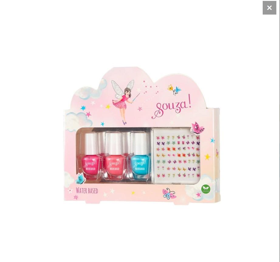 Σετ με μανό και διακοσμητικά αυτοκόλλητα νυχιών. Όλα τα καλλυντικά της εταιρείας Souza είναι vegan, δερματολογικά ελεγμένα και έχουν βάση το νερό ώστε να είναι φιλικά προς το περιβάλλον και το παιδί.