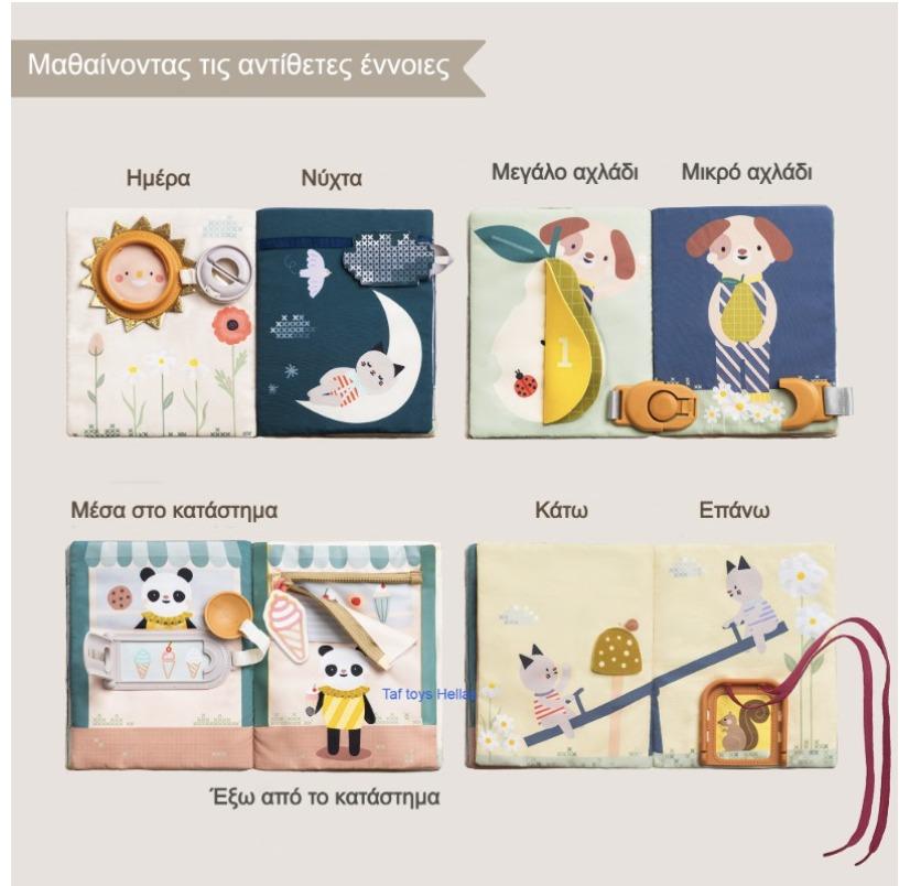 Διαφορετικές υφές, τρισδιάστατα παιχνίδια δραστηριοτήτων, συμπεριλαμβανομένου ενός μασητικού και μιας τσέπης παιχνιδιού.