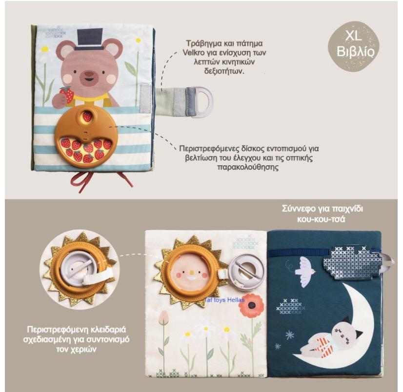 Το βιβλίο στέκεται μόνο του για να βοηθήσει στην ενθάρρυνση του παιχνιδιού κατά την στήριξη του μωρού στην κοιλίτσα του ,γεμάτο με πτυχώσεις, για να βοηθά το μωρό να κατανοήσει την ιδέα της αιτίας και του αποτελέσματος.
