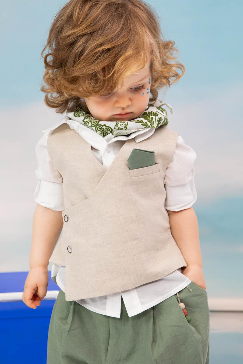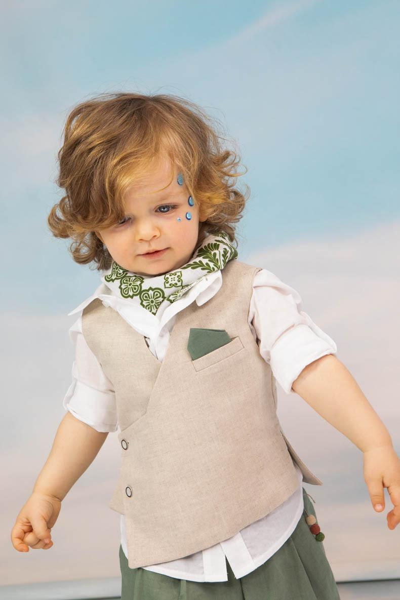 Ο Thanos είναι ένα στιλάτο σετ βάπτισης με ψάθινο γιλέκο τύπου classic αμάνικο σακάκι συνδυασμένο με γκρι ανοιχτό πουά cotton πουκάμισο και blue παντελόνι.