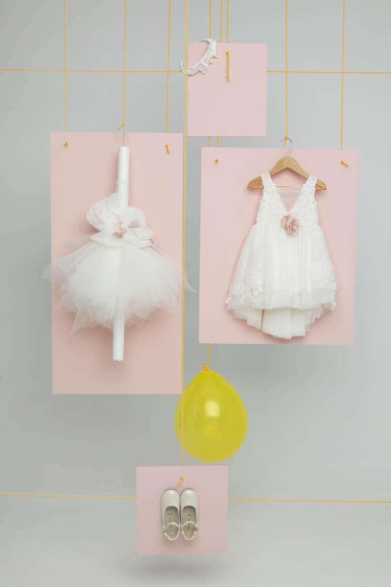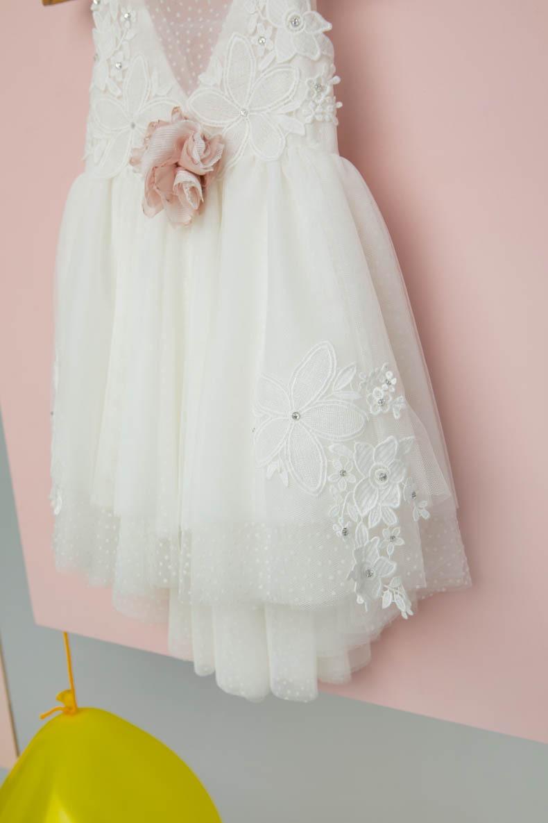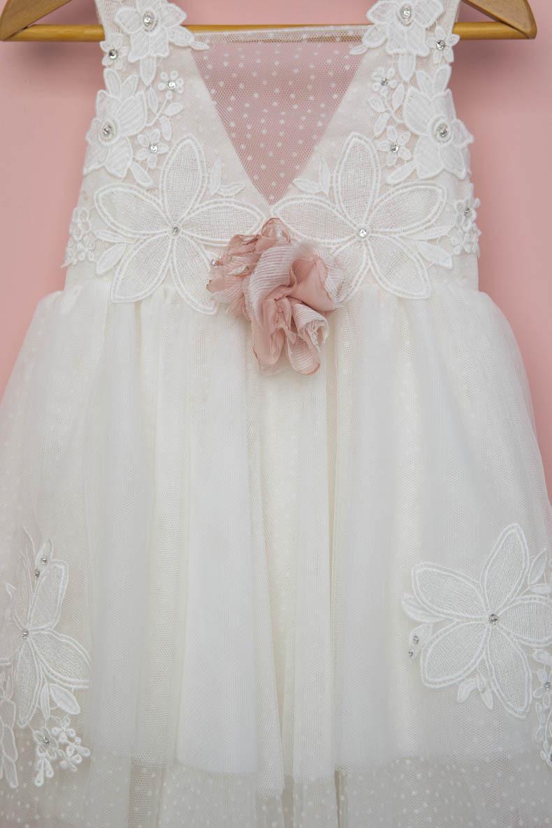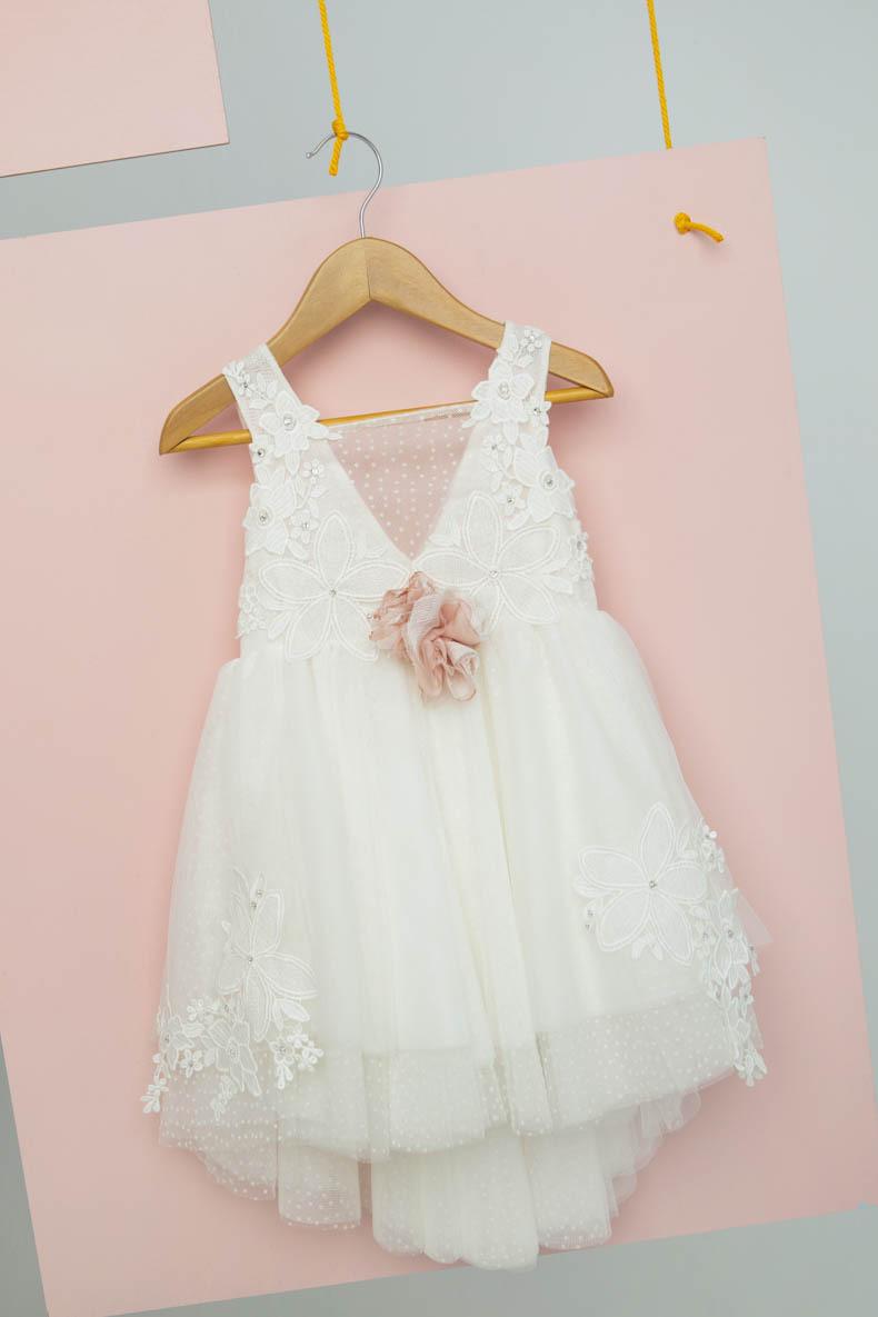 Εκρού φόρεμα με χειροποίητο σάπιο μήλο λουλούδια για στολισμό. Κεντημένα βαμβακερά μοτίφ στολίζουν το φόρεμα. Σατέν φιόγκος στο πίσω μέρος του φορέματος. Αξεσουάρ: Σατέν κορδέλα με κεντημένο μοτίφ. Σύνθεση υφασμάτων: Πουά τούλι Γαλλιας, εκρού τούλι Γαλλίας, Κρεπ σατέν Γαλλίας, 100% Cotton. Ελληνικής ραφής.