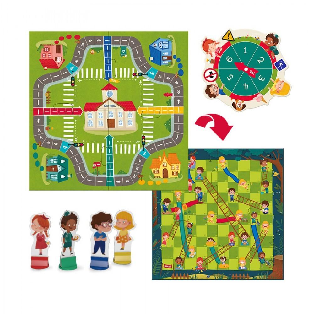 Ένα επιτραπέζιο που θα ενθουσιάσει τα παιδιά καθώς συνδυάζει 2 διαφορετικά παιχνίδια: Τον Γκρινιάρη και το Φιδάκι! Στο πρώτο, τα παιδιά πρέπει να βοηθήσουν τους χαρακτήρες να φτάσουν, με ασφάλεια, από το σπίτι στο σχολείο και με αυτόν τον τρόπο μαθαίνουν βασικούς κανόνες κυκλοφοριακής αγωγής. Στο Φιδάκι, μαθαίνουν για τις καλές και τις κακές συνήθειες μέσα από ένα ταμπλό όπου πρέπει να μετακινήσουν τα πιόνια τους από την εκκίνηση στον τερματισμό!