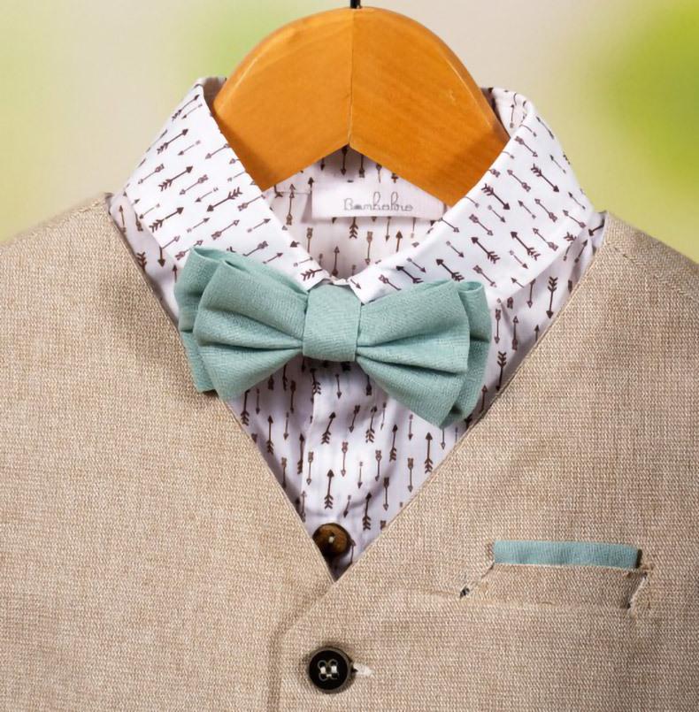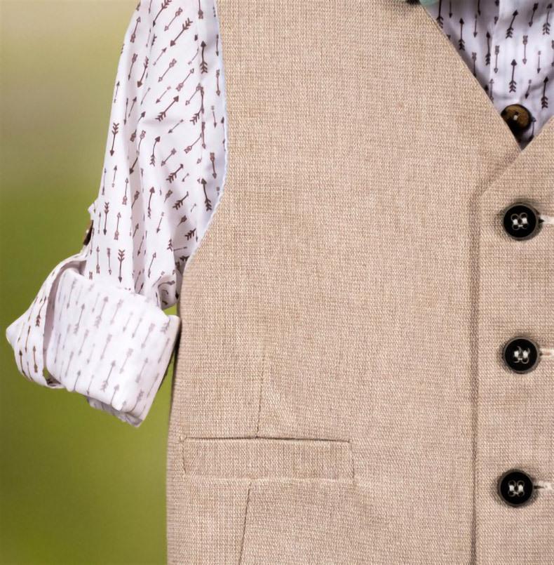 Λινό παντελόνι με λευκό cotton πουκάμισο με print βέλη. Συνδυάζεται με classic beige γιλέκο.