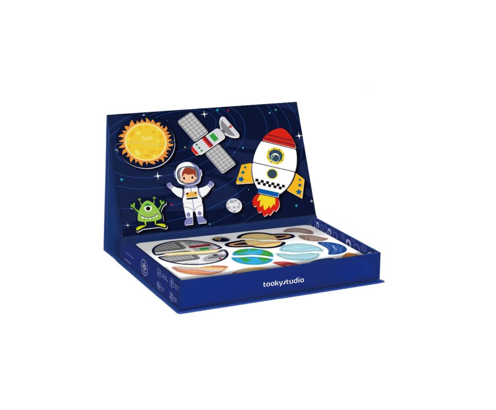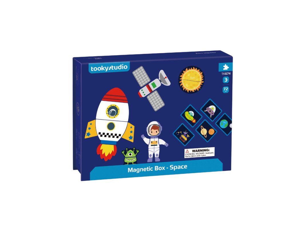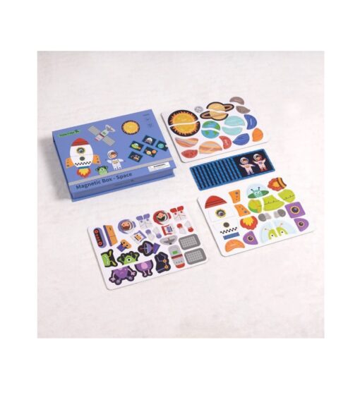 Το μαγνητικό κουτί διάστημα είναι ένα δημιουργικό σετ παιχνιδιού που θα εξάψει τη φαντασία των παιδιών που λατρεύουν το διάστημα. Αυτό το σετ περιλαμβάνει διαστημικά στοιχεία με πλανήτες, τον ήλιο, διαστημόπλοια και αστροναύτες. Κάθε σχέδιο χωρίζεται σε μαγνητικά κομμάτια, επιτρέποντας στα παιδιά να διασκεδάσουν ατελείωτες ώρες, συναρμολογώντας τα για να σχηματίσουν τα διαστημικά τους αριστουργήματα. Η πραγματική μαγεία αυτού του σετ βρίσκεται στο ταμπλό, που υπάρχει στο κουτί, και χρησιμεύει ως τέλειος καμβάς για την τακτοποίηση των μαγνητικών κομματιών, δημιουργώντας τις δικές τους σκηνές.