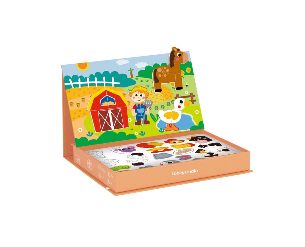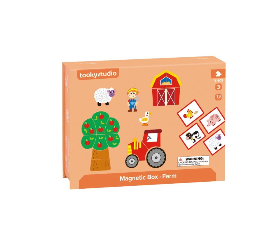 Το μαγνητικό κουτί φάρμα είναι ένα διασκεδαστικό παιχνίδι που μεταφέρει τους μικρούς λάτρεις της περιπέτειας στο μαγευτικό κόσμο της φάρμας. Μέσα στο κουτί υπάρχουν υπέροχα σχέδια ζώων φάρμας, ένας αχυρώνας, ένας φιλικός αγρότης, ένα τρακτέρ και μια μηλιά. Κάθε σχέδιο χωρίζεται σε κομμάτια παζλ, επιτρέποντας στα παιδιά να συναρμολογούν εύκολα τις δικές τους σκηνές μιας φάρμας. Η μαγεία του σετ βρίσκεται στα μαγνητικά κομμάτια που κολλάνε πάνω στο ταμπλό του κουτιού. Ως επίδοξοι αγρότες τα παιδιά μπορούν να καλλιεργήσουν τη δημιουργικότητά τους και τις λεπτές κινητικές τους δεξιότητες εξερευνώντας τις χαρές της αγροτικής ζωής. Είτε πρόκειται για την τακτοποίηση των ζώων στον αχυρώνα είτε για μια βόλτα με το τρακτέρ, αυτό το σετ ενθαρρύνει τη μάθηση και την αφήγηση ιστοριών.