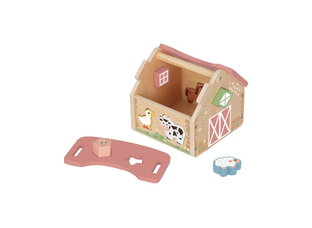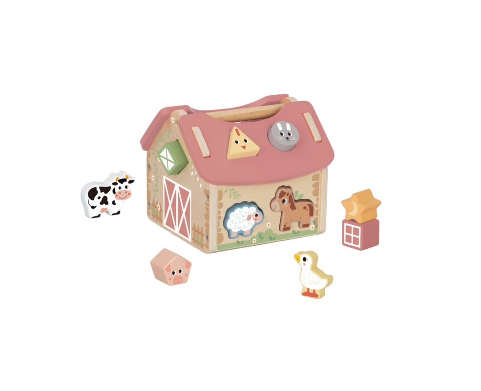Με 4 ξύλινα ζώα και 6 σχήματα προς ταξινόμηση, οι δυνατότητες για παιχνίδι είναι ατελείωτες. Καθώς ταιριάζουν σχήματα και ζώα, τα παιδιά όχι μόνο αναπτύσσουν τις λεπτές κινητικές τους δεξιότητες αλλά και ενισχύουν την αντίληψη του χώρου και την αναγνώριση σχημάτων. Το σπιτάκι – φάρμα διαθέτει λαβή μεταφοράς για το παίρνετε μαζί σας παντού. Η αφαιρούμενη οροφή επιτρέπει την εύκολη πρόσβαση στα σχήματα, που είναι μέσα, εξασφαλίζοντας ατελείωτη απόλαυση παιχνιδιού.