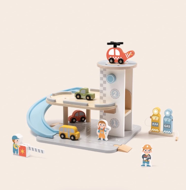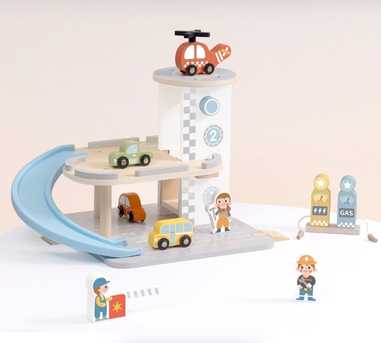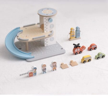 Πρόκειται για ένα όμορφο πάρκινγκ γκαράζ που διαθέτει: 2 επίπεδα στάθμευσης που συνδέονται με μια πλαστική ράμπα για να γλιστρούν τα αυτοκίνητα. Επίσης, διαθέτει ένα ελικοδρόμιο στην ταράτσα με ξύλινο ελικόπτερο. Μικρά ξύλινα αυτοκίνητα σε διάφορα χρώματα για πιο ευφάνταστο παιχνίδι. Υπάρχει σταθμός ανεφοδιασμού με ξύλινες αντλίες βενζίνης και φόρτισης. Αξεσουάρ, όπως πινακίδες κυκλοφορίας και ξύλινες φιγούρες που αναπαριστούν χαρακτήρες, κάνουν το παιχνίδι πιο ρεαλιστικό. Αυτό το σετ ενθαρρύνει τα παιδιά να μιμηθούν ρόλους, προωθώντας την αφήγηση ιστοριών, τις λεπτές κινητικές δεξιότητες και την αντίληψη του χώρου. Ο συνδυασμός ξύλινων και πλαστικών στοιχείων εξασφαλίζει ανθεκτικότητα και μια συναρπαστική εμπειρία παιχνιδιού.