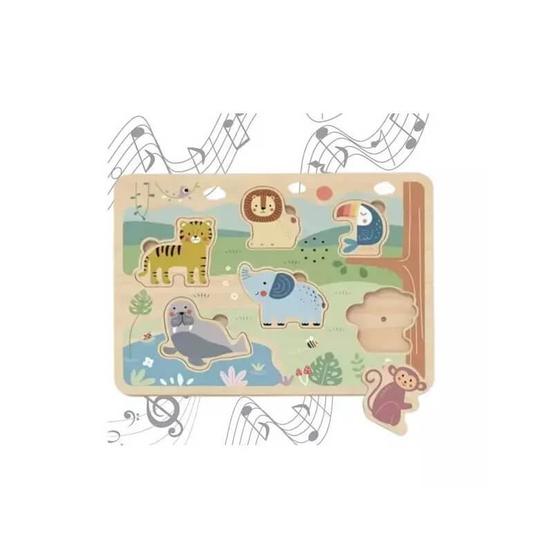 Αυτό το ξύλινο παζλ αποτελείται από 6 ξύλινα ζωάκια, τα οποία, όταν τοποθετηθούν στη σωστή θέση, παράγουν τον αντίστοιχο ρεαλιστικό ήχο από κάθε ζωάκι. Με το παζλ τα παιδιά καλλιεργούν τη λογική σκέψη, την υπομονή, την παρατηρητικότητα και παράλληλα αναπτύσσουν το συντονισμό ματιού – χεριού.