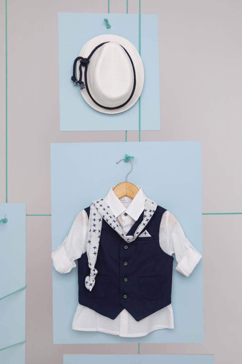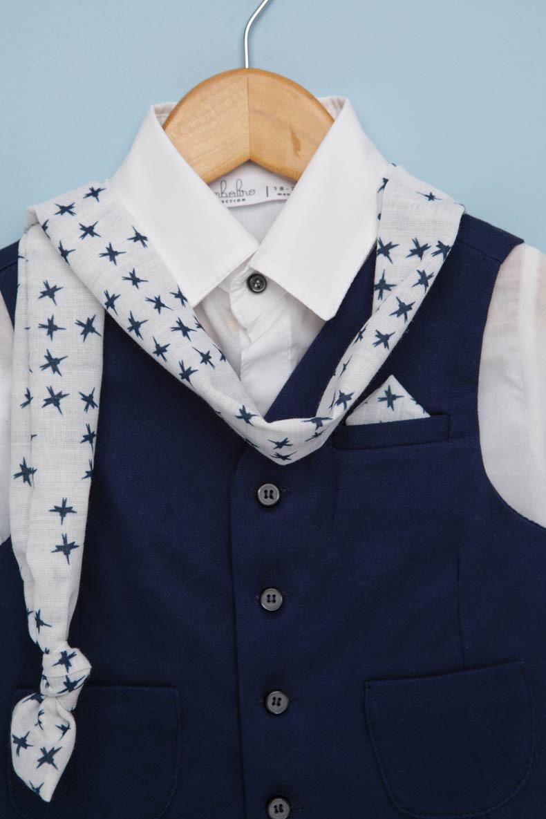 Ο Valentinos είναι ο ξεχωριστός συνδυασμός μπλε με γκρι που αρέσει πολύ. Γιλέκο μπλε καπαρντίνα diagonal με στρογγυλές τσέπες. Πουκάμισο λευκό 100% cotton. Παντελόνι γκρι από soft καπαρτινα Ιταλιας με μπλε δερμάτινη ζώνη. Φουλάρι και μαντήλι έκρου με printed αστέρια μπλε. Καπέλο λευκό καβουράκι με μπλε κορδόνι.